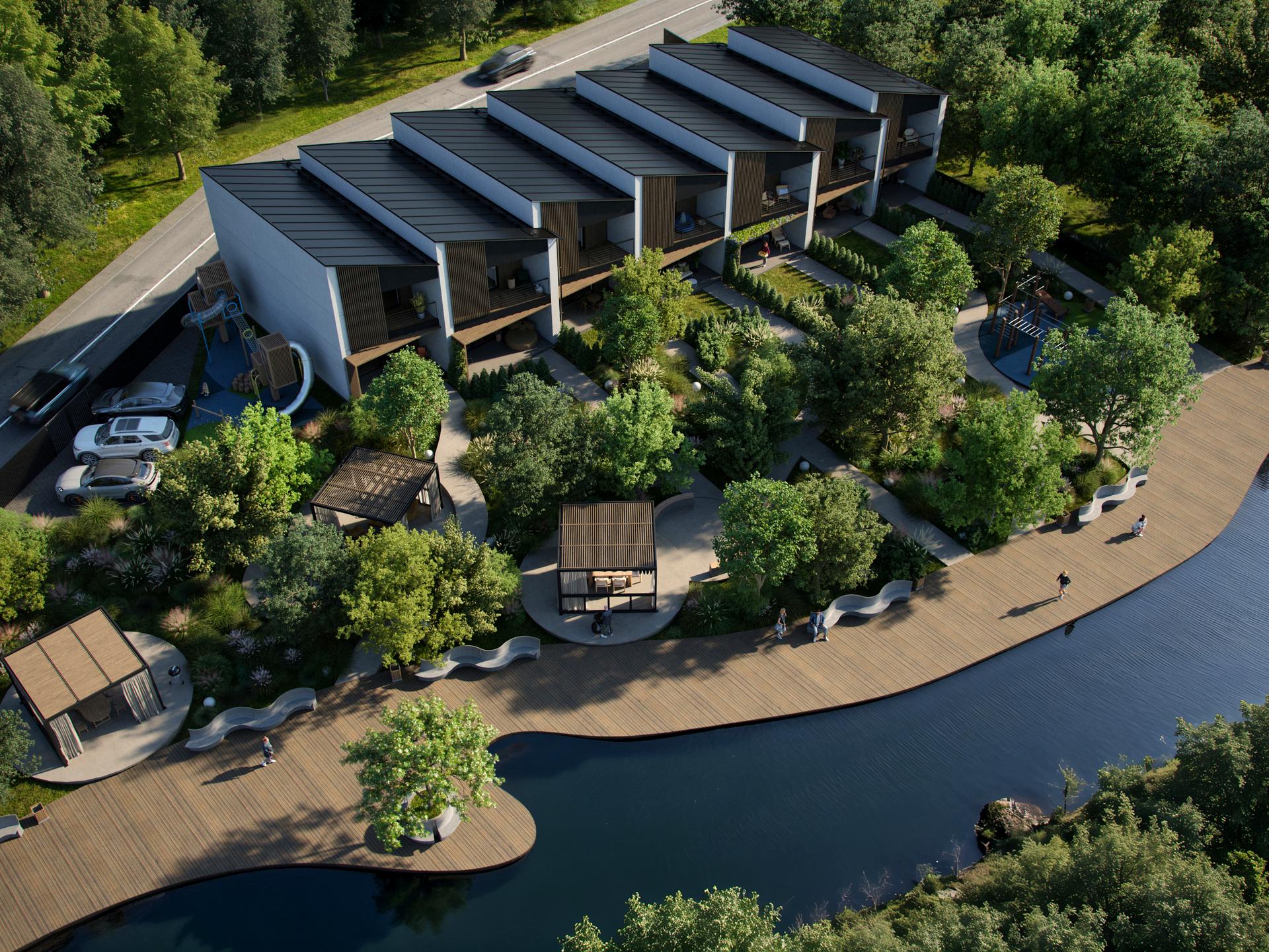 Навколо сосновий ліс, чисті озера, власна набережна та природна тиша. Територія закрита, контрольована, з обмеженим доступом, що гарантує комфорт і безпеку. Тут продумано кожну деталь, щоб мешканці отримували максимум простору, чистого повітря та відчуття дому.