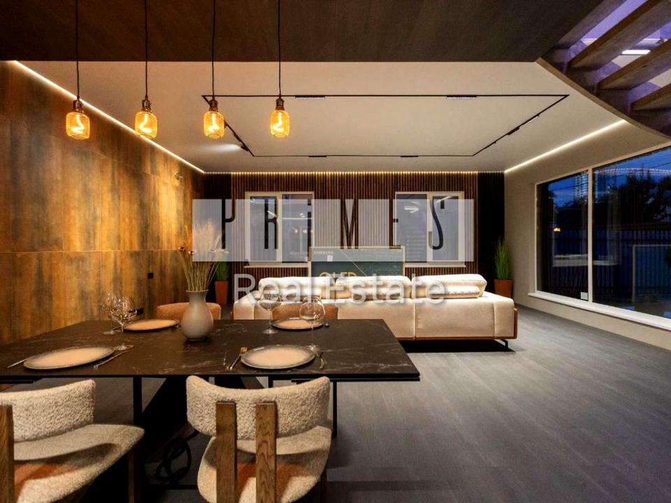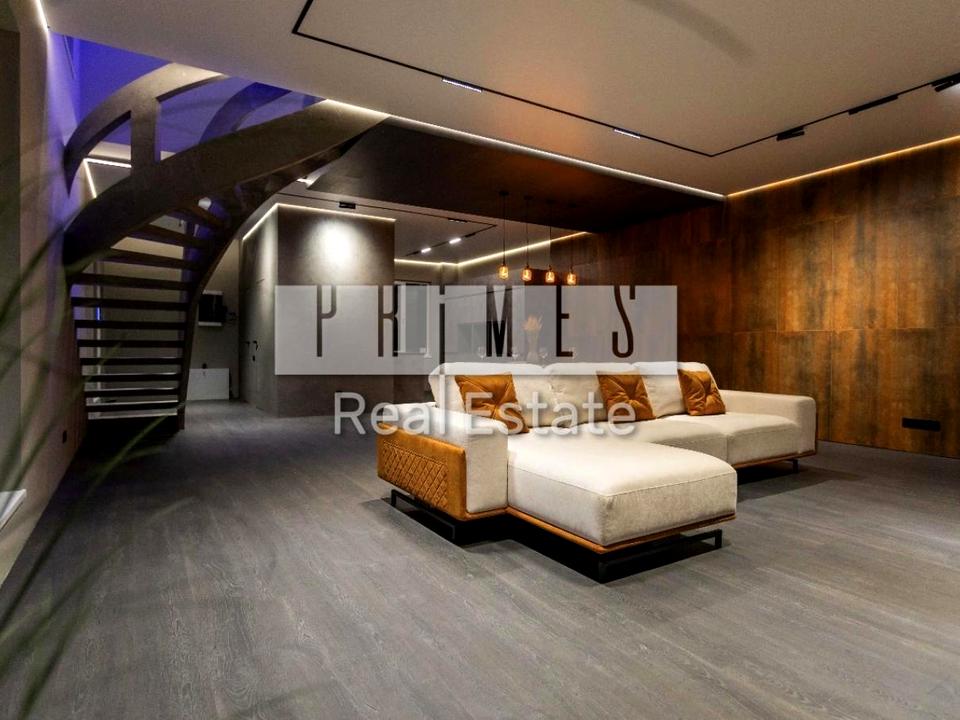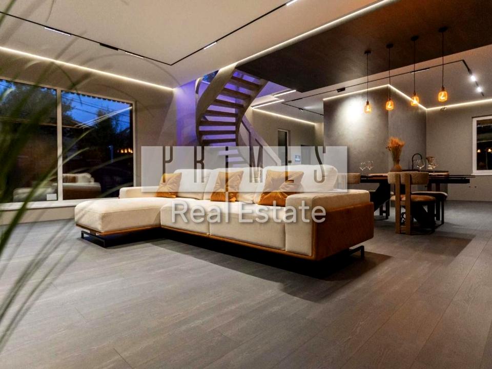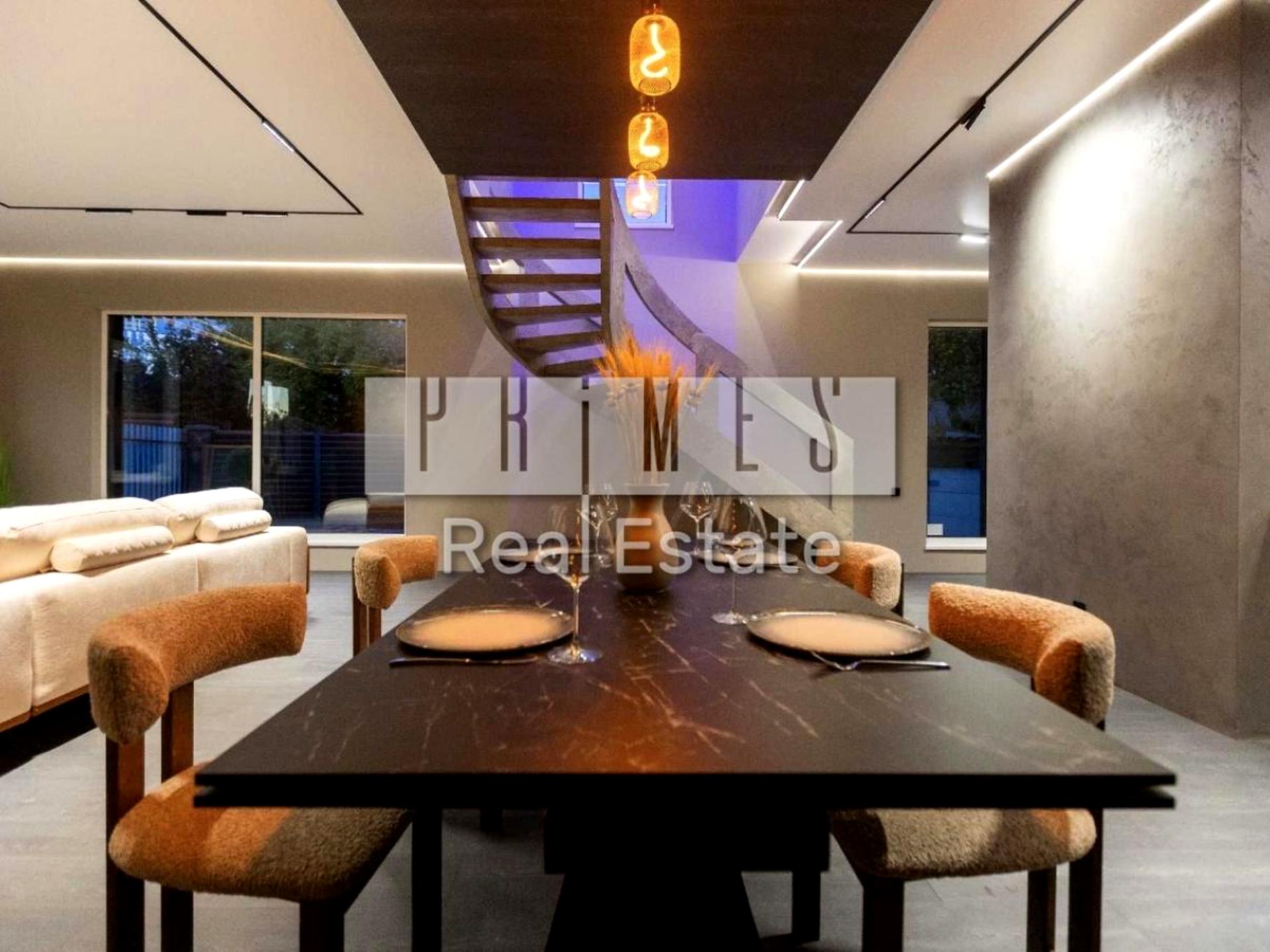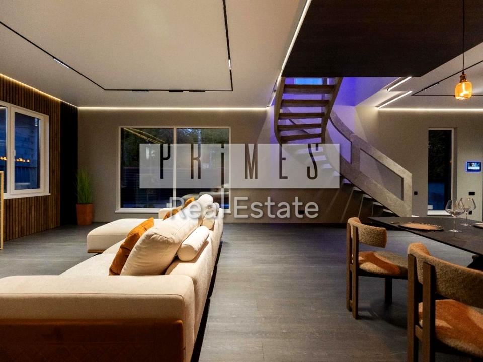 Інтер’єр: Ексклюзивні сходи, диван BLANCHE, італійський стіл із подвійної кераміки, дерев’яні стільці. Декоративне оздоблення стін, сучасне освітлення. Техніку можна обрати під власні вподобання (Bosch, Samsung, Gaggenau тощо). Будинок збудований “для себе” — із турботою про кожну деталь.