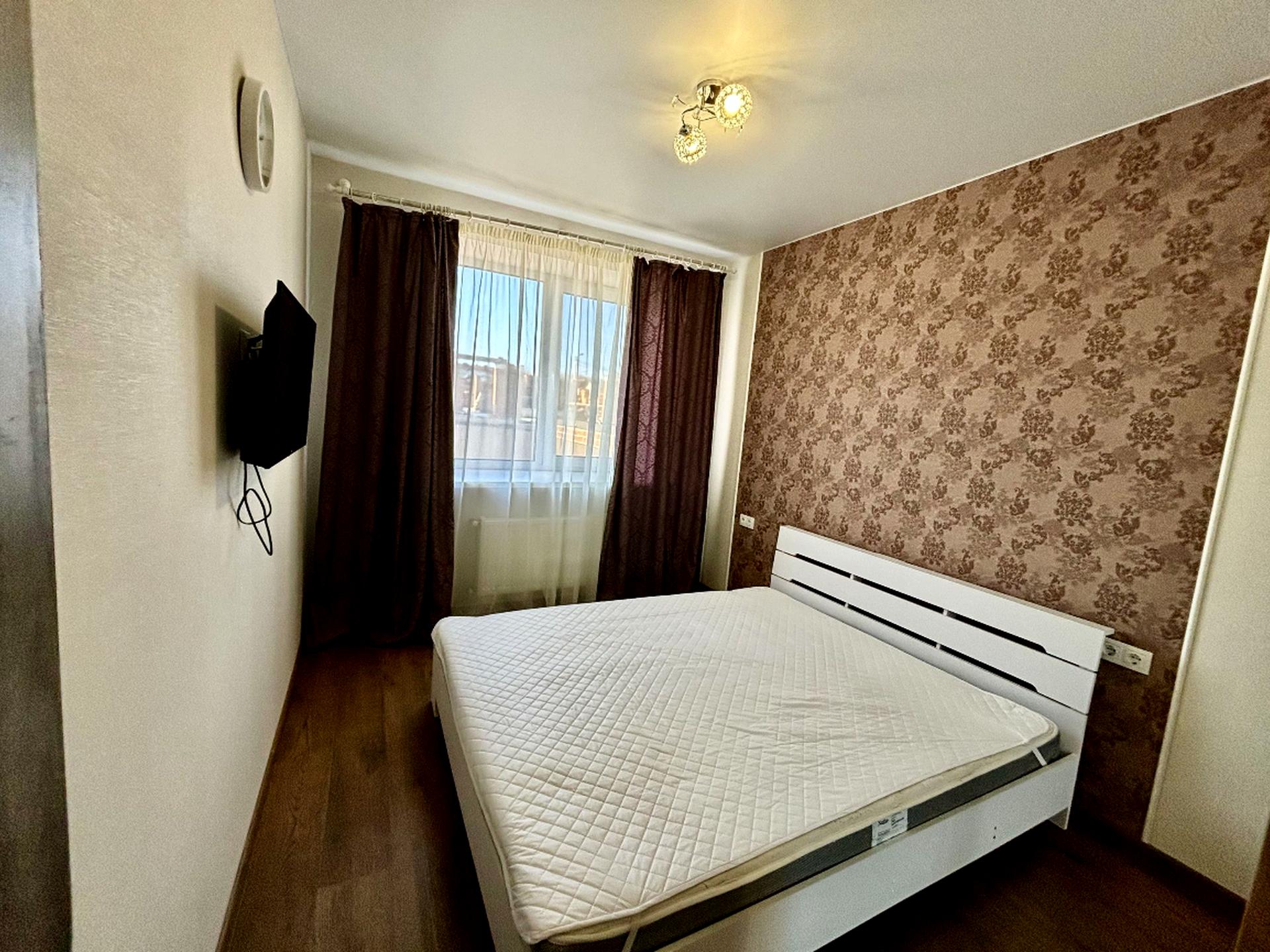 В кімнаті велика шафа та двоспальне ліжко, телевізор.