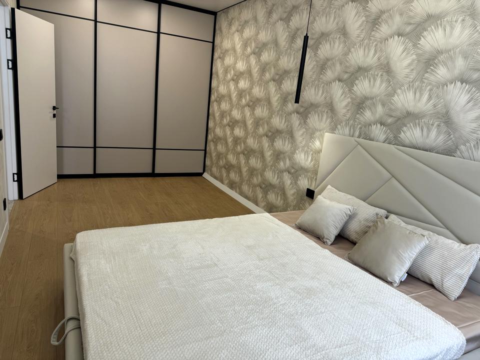 В кімнаті велике двоспальне ліжко і велика шафа купе.