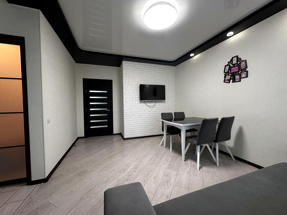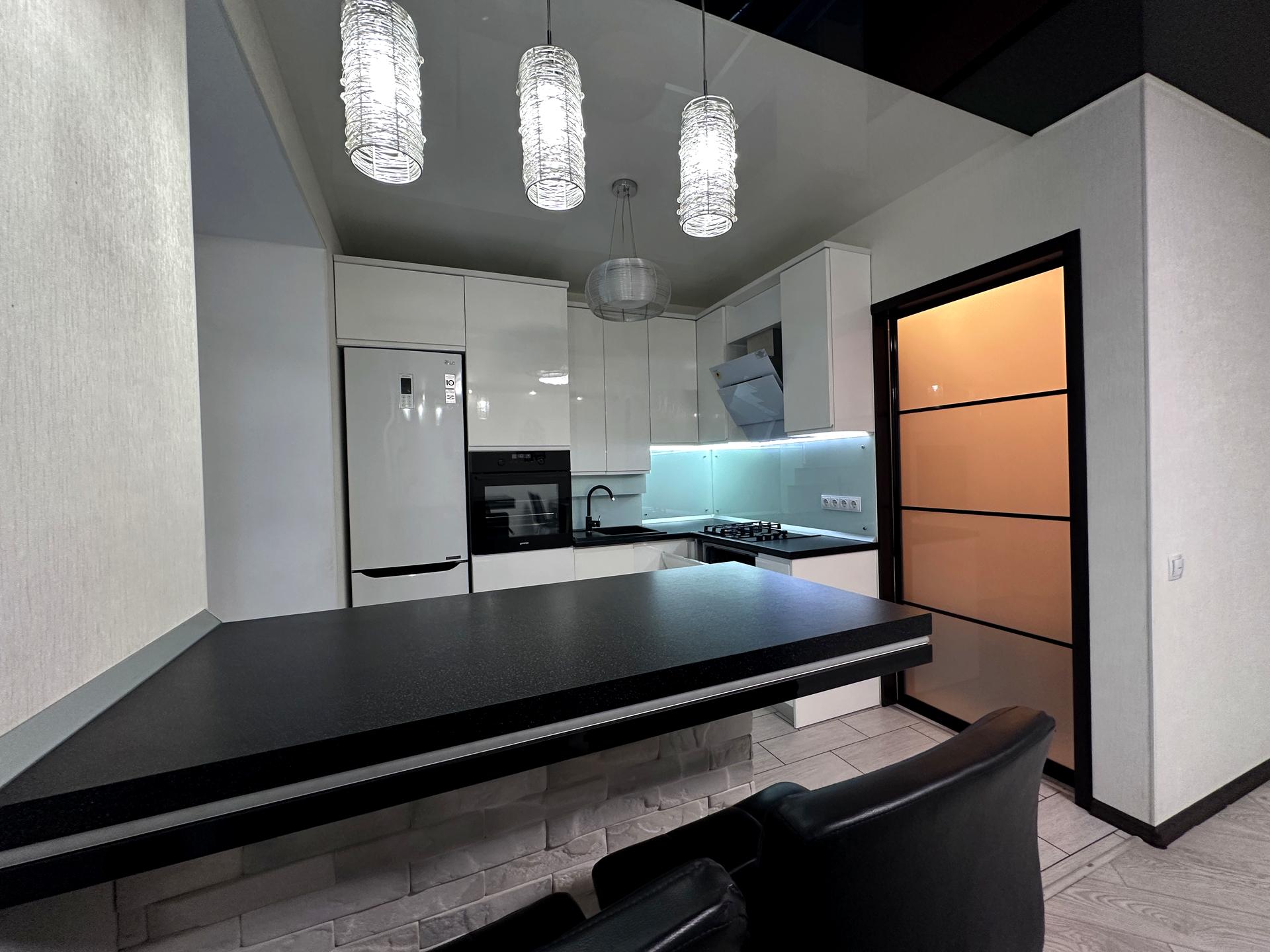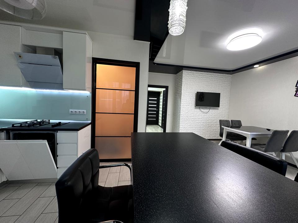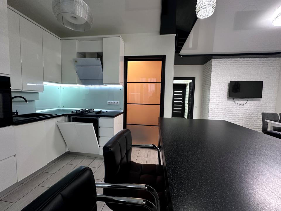 Квартира має велику простору кухню-вітальню, яка є головною зоною для сімейного відпочинку та прийому гостей. Світлий інтер’єр, панорамні вікна та якісний ремонт створюють атмосферу затишку та сучасності. Мебльована вітальня переходить у функціональну кухонну зону з барною стійкою, технікою та достатньою кількістю місця для зберігання.