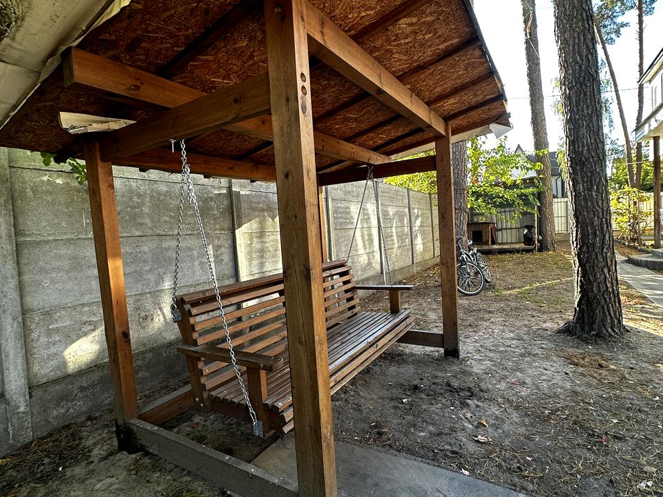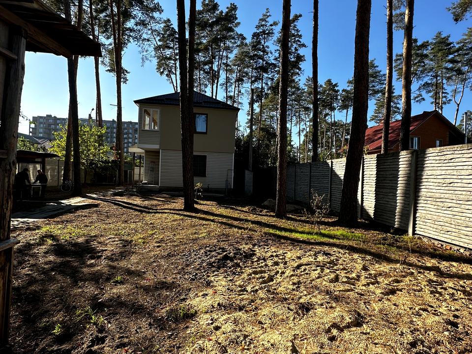 На ділянці величезні сосни, гойдалка, гараж під авто, тимчасова альтанка та вольєр для собаки.
