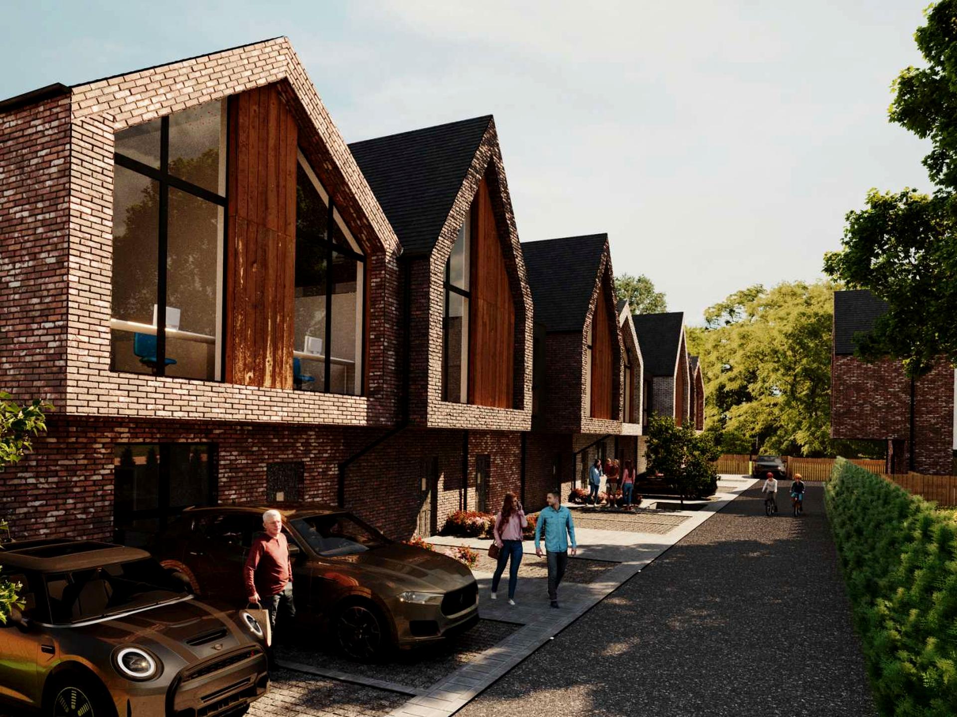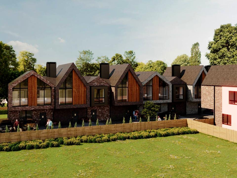 - Передній двір – вимощений бруківкою з клумбою між таунами;
