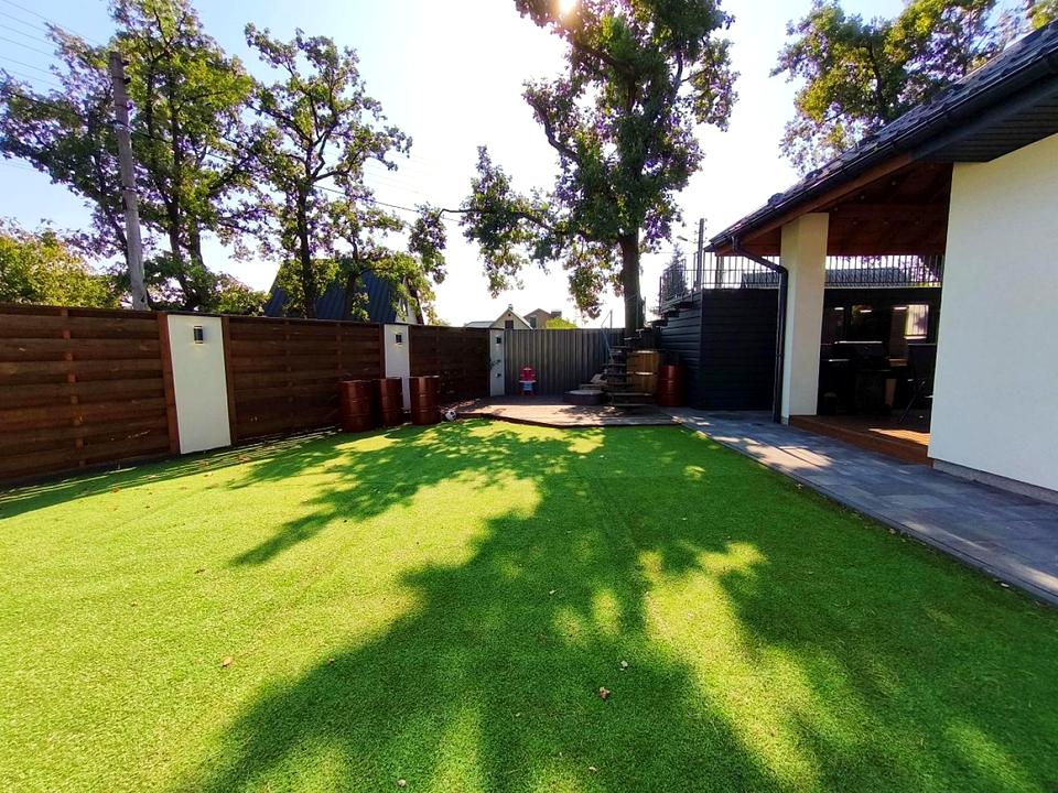 Будинок розташований на закритій території серед дубів та сосен, де панує тиша та відчуття простору. Площа будинку — 112,7 м², ділянка — 6 соток. На території є окрема баня з відкритою терасою, автоматичні ворота, вуличне освітлення, насадження ззовні паркану та зручний господарський будиночок. Усе продумано до деталей для вашого комфорту.