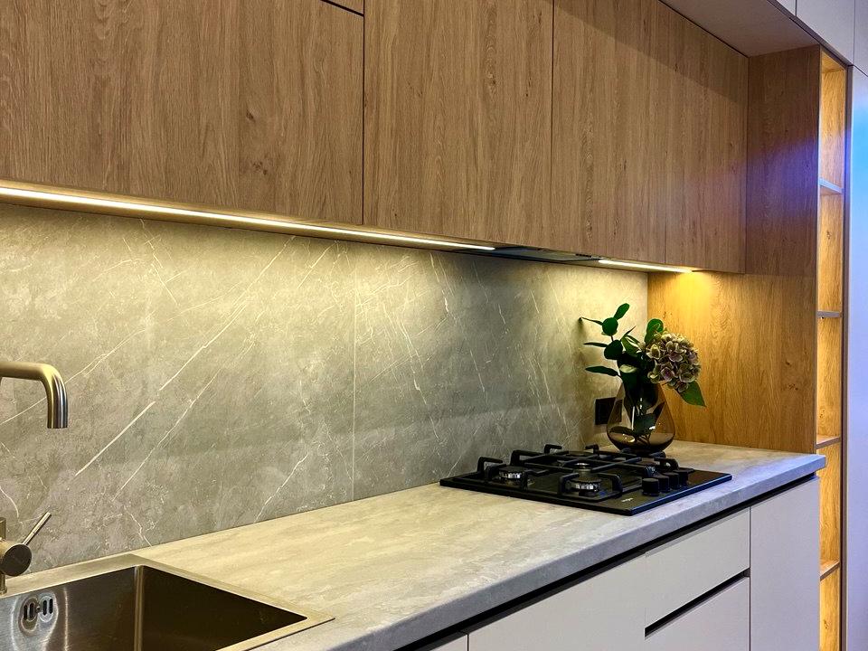 Вбудована духова шафа, варильна поверхня, холодильник, посудомийна машина, пральна машина, мікрохвильова піч.