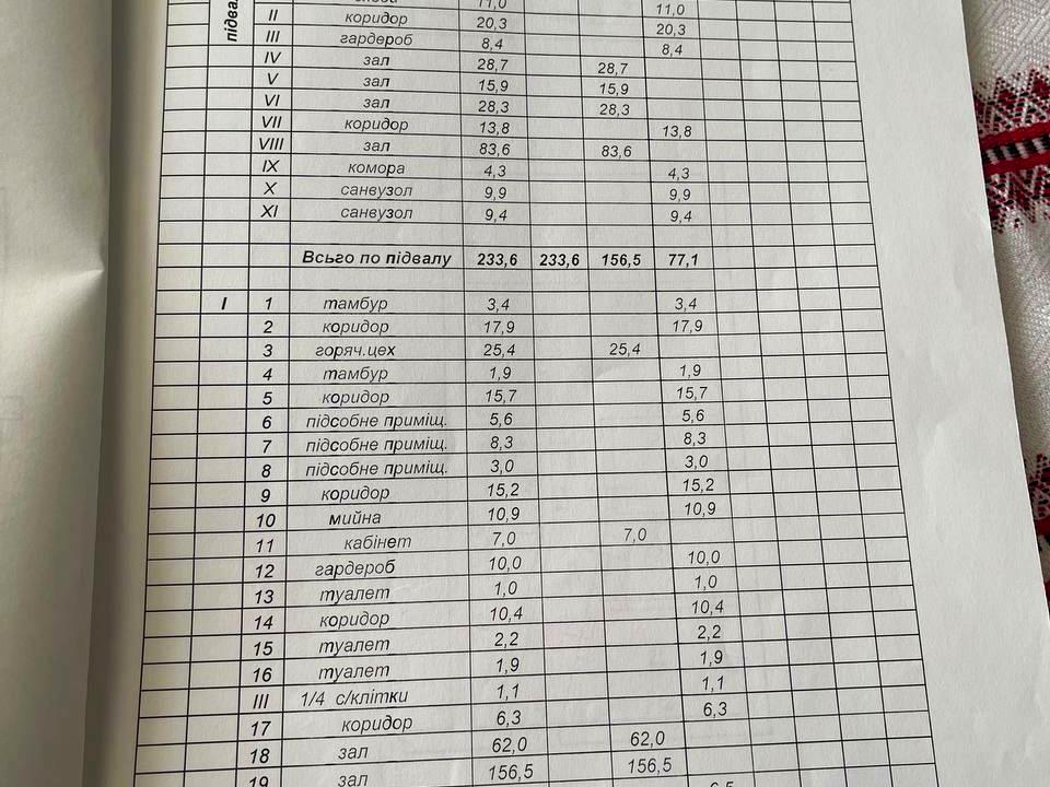 Загальна площа 700м2 – перший поверх кухня, великий зал , зал по менше , санвузли і безліч кабінетів і т д .