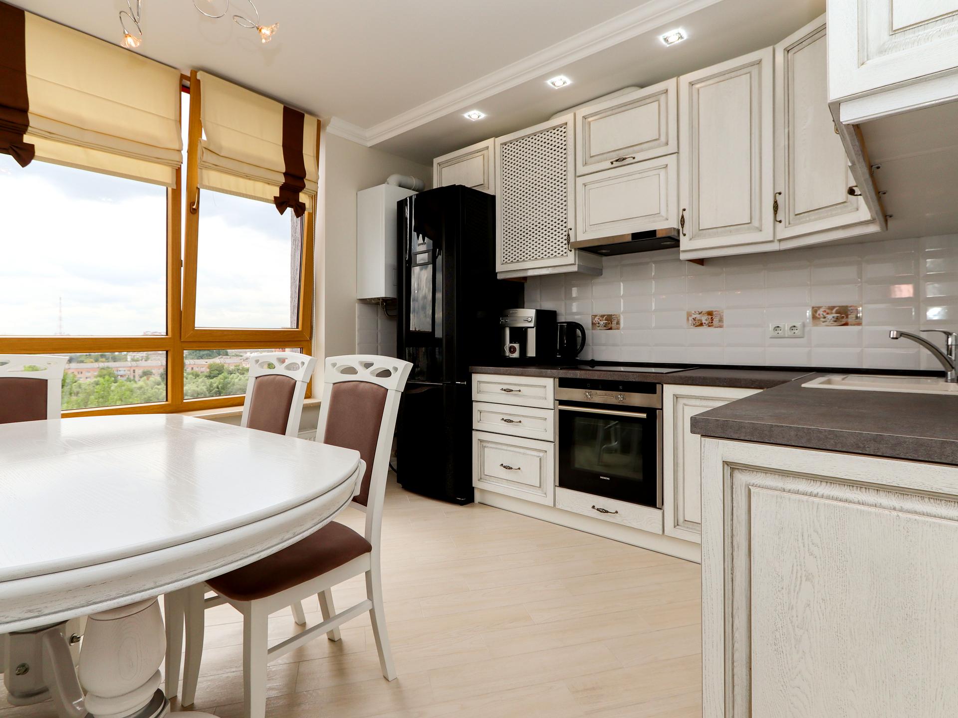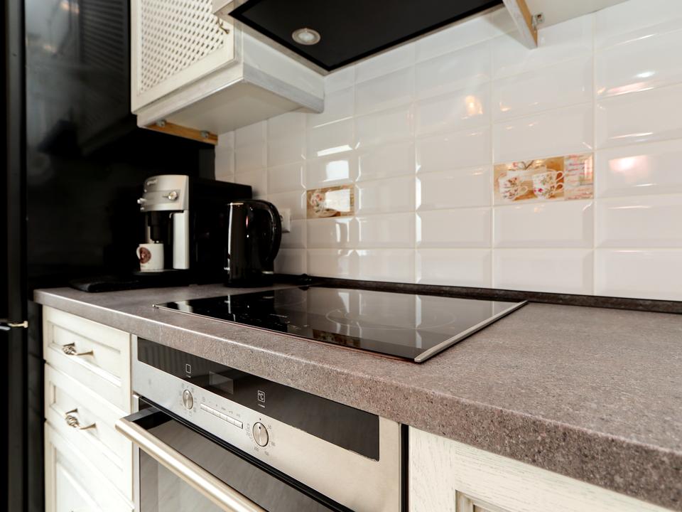 Кухня містить поверхні для приготування їжі, шафи для посуду та побутову техніку (варильна панель, духова шафа, кавова машина), що полегшать процес готування. Кімната з якісними міжкімнатними дверима є двоспальне ліжко та велику шафу. Ванна кімната з необхідною сантехнікою, є пральна машина.