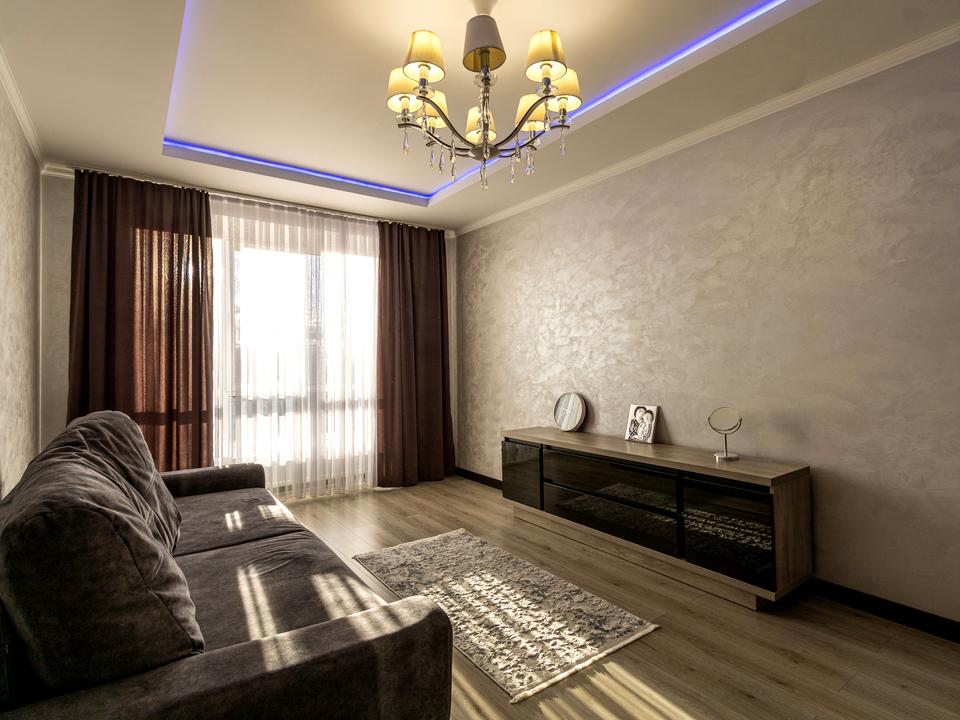 Вітальня — велика, простора та надзвичайно світла завдяки панорамним вікнам. Тут є зручний диван для приємного перегляду фільмів та велика шафа для гардеробу.