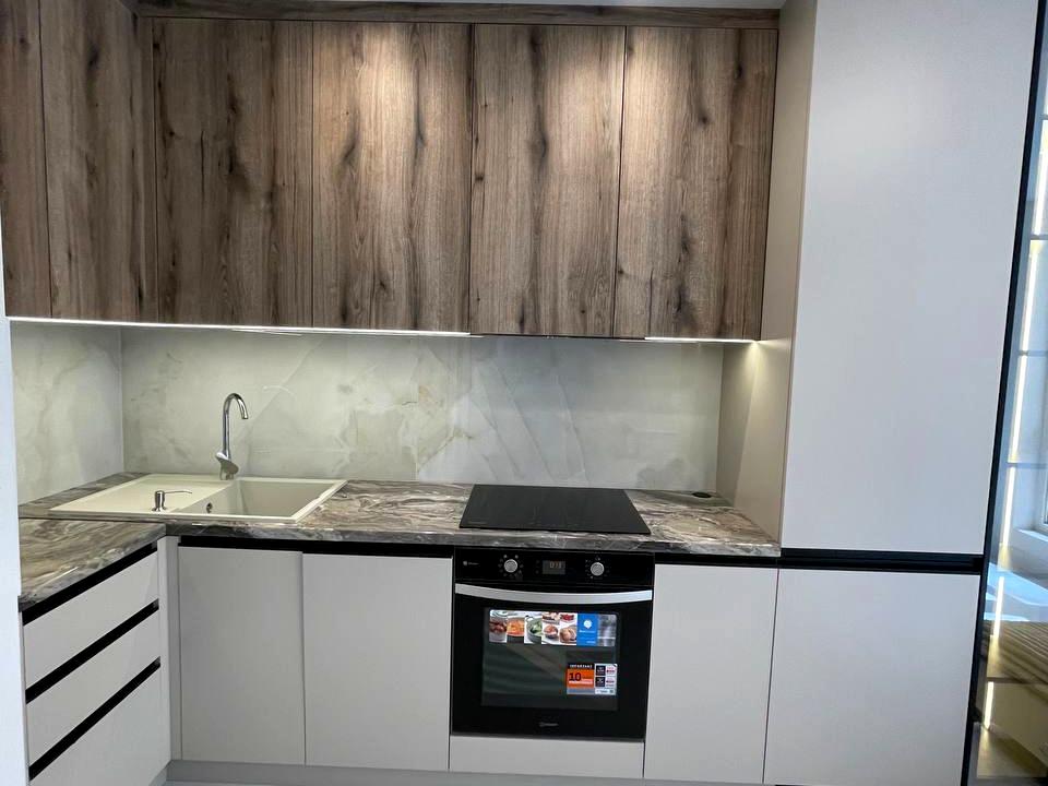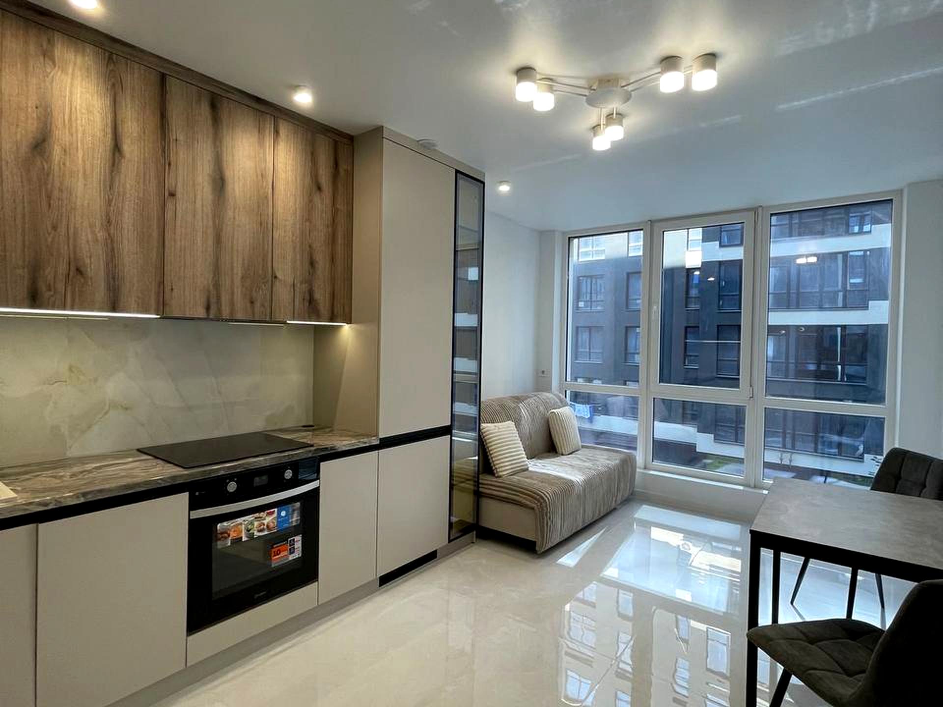 Обладнана всім необхідною технікою, посудомийною машиною, вбудованим холодильником, індукційною плитою, духовою шафою, витяжкою, пральною машиною, кондиціонером.
