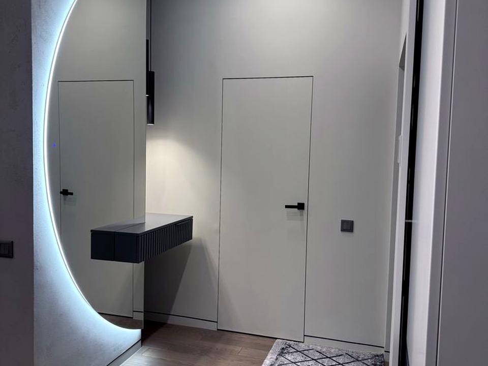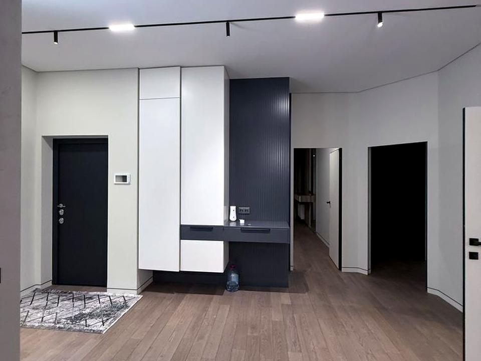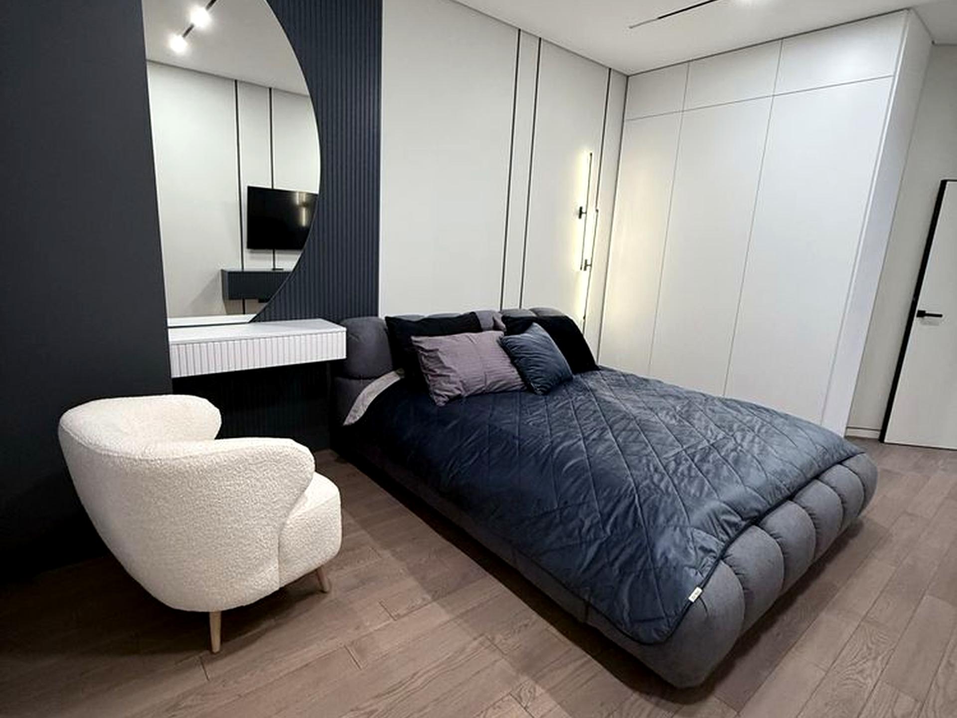 Квартира виконана у вишуканих сіро-білих тонах, виглядає дорого, сучасно й естетично. Простір продуманий до дрібниць, багато світла, дзеркал та зон зберігання.