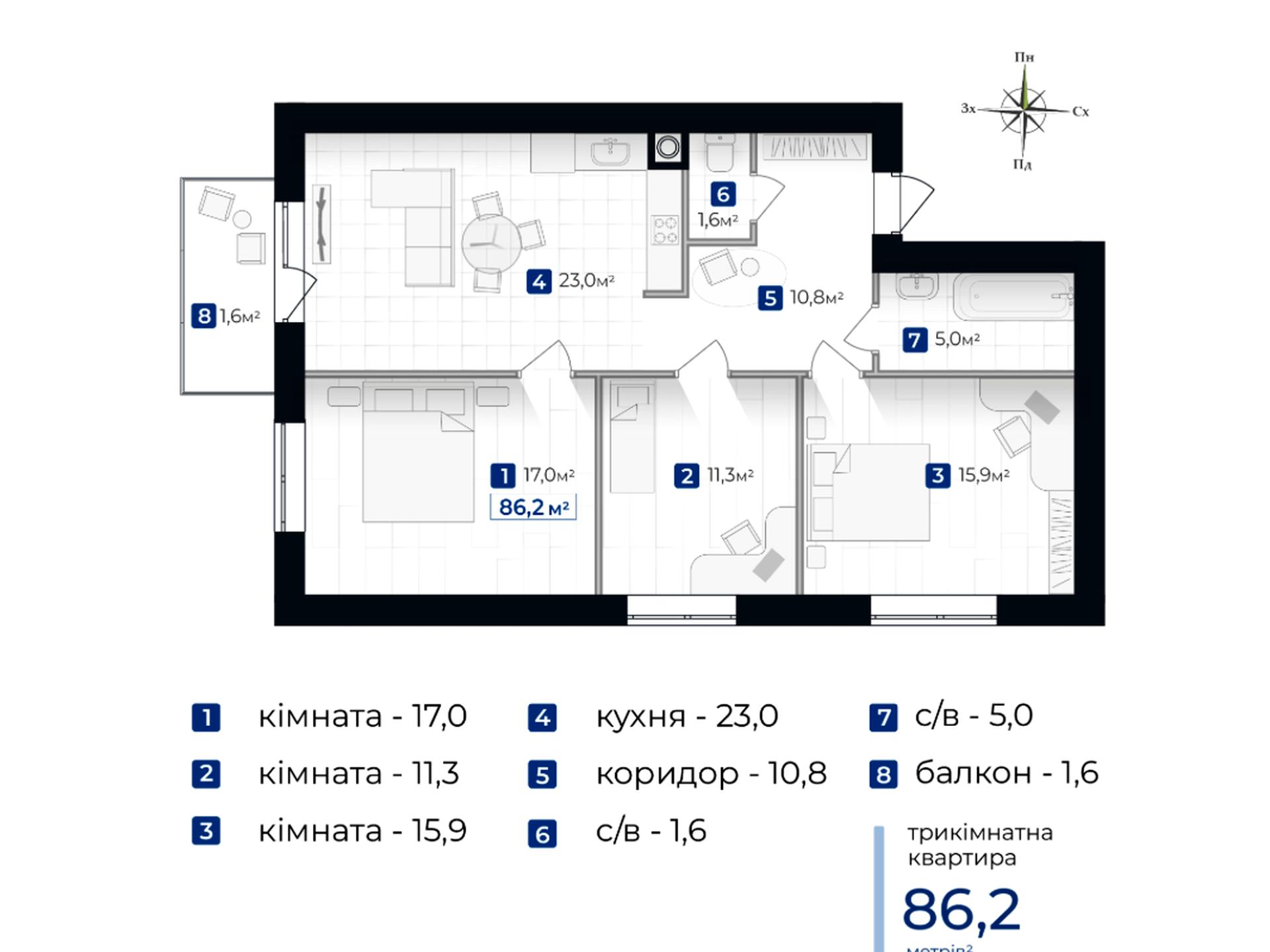 • Кімнати: 3, роздільне планування