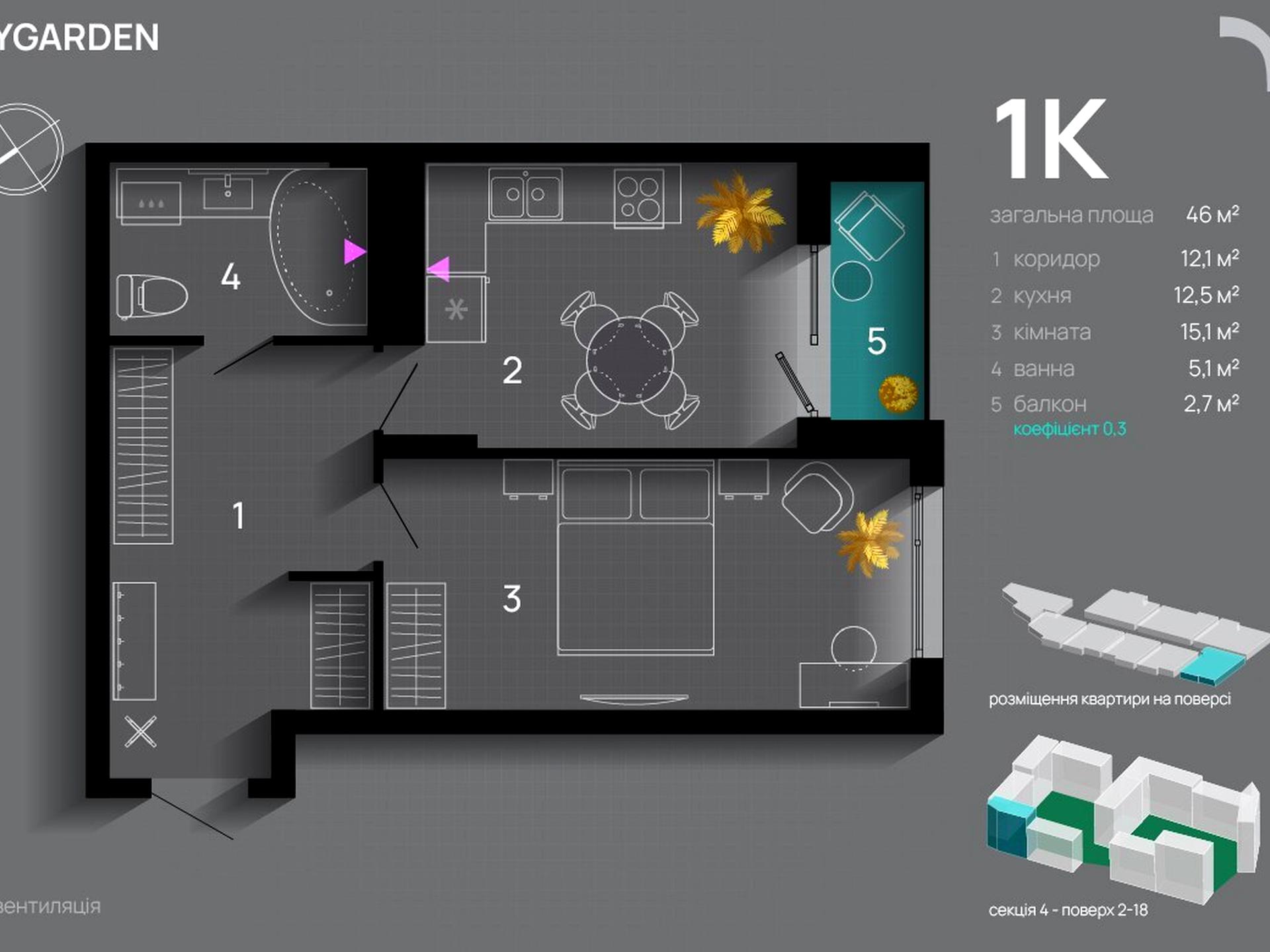 Сучасна квартира площею 46 м² розташована на 6 поверсі з 18 у стильному та комфортному житловому комплексі.