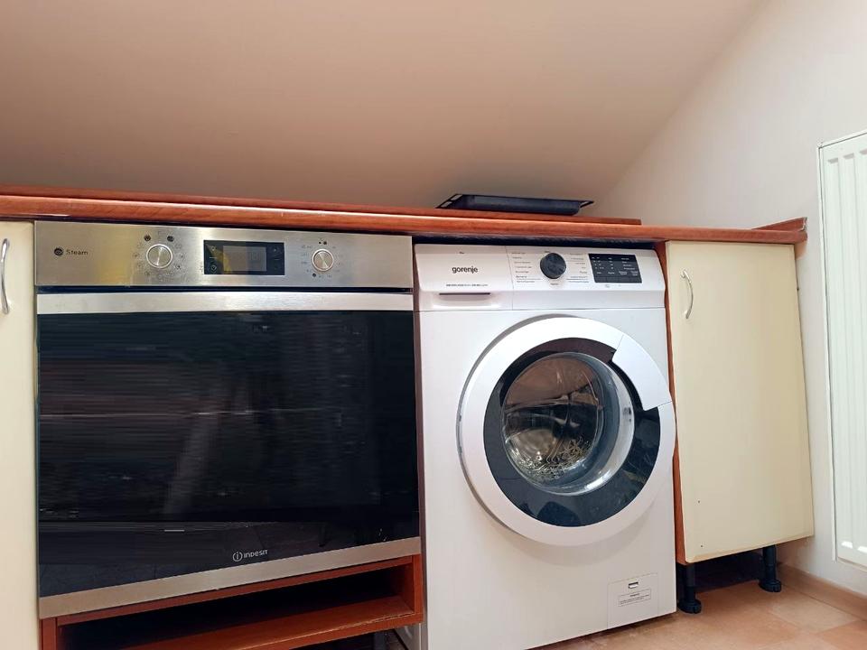 телевізор, диван, двоспальне ліжко, холодильник, духова шафа.