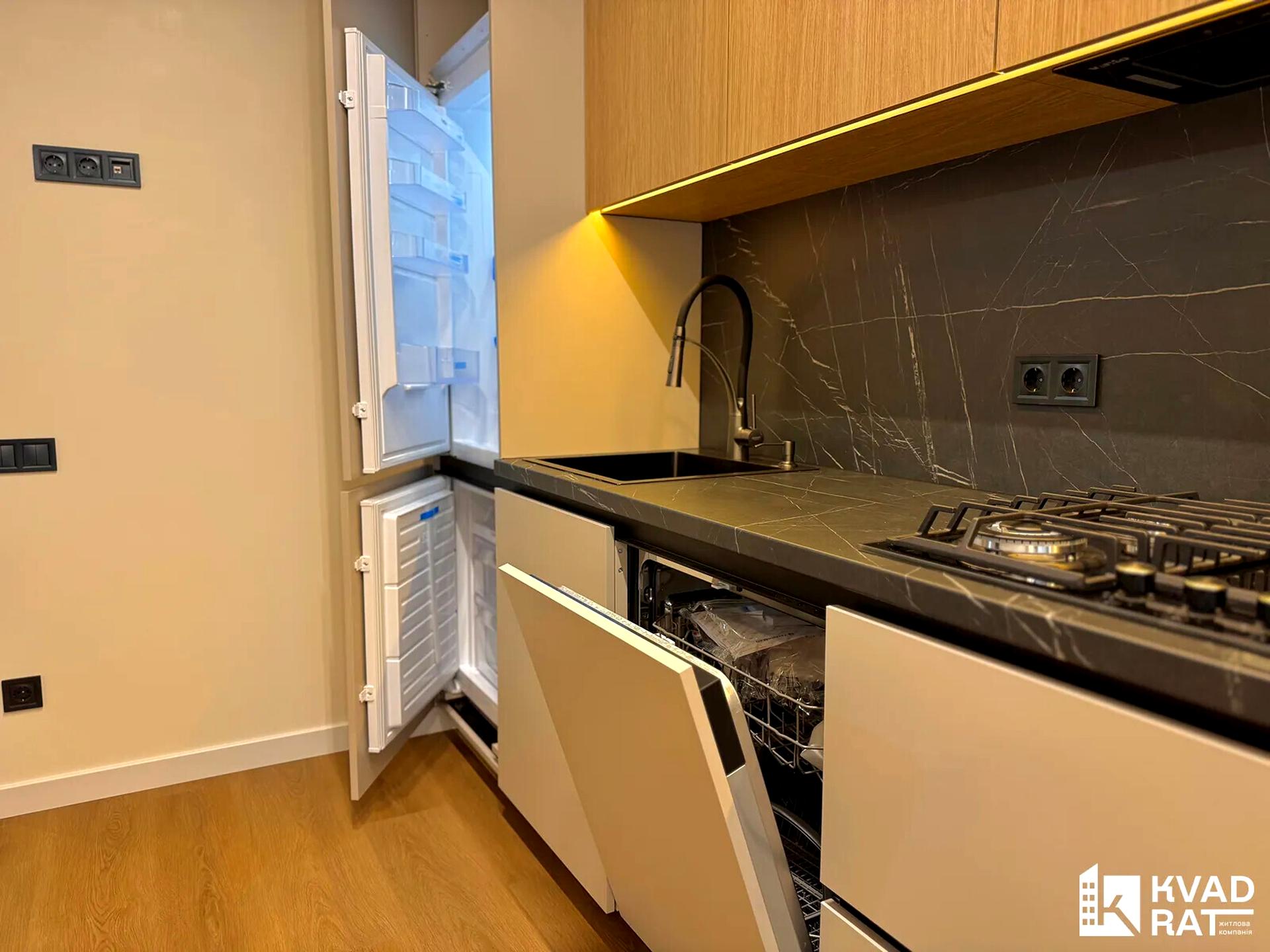 - кухня повнісю укомплектована холодильником, посудомийкою, мікрохвильова піч, духова шафа, газовий котел та тепла підлога по цілій квартирі