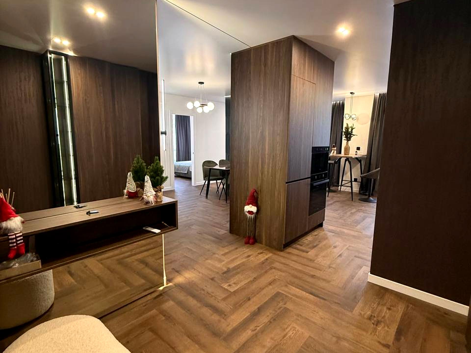 Світла квартира загальною площею 71,8 м², площа кухні — 11 м². Розташована на 5-му поверсі 8-поверхового будинку, у локації неподалік від річки.