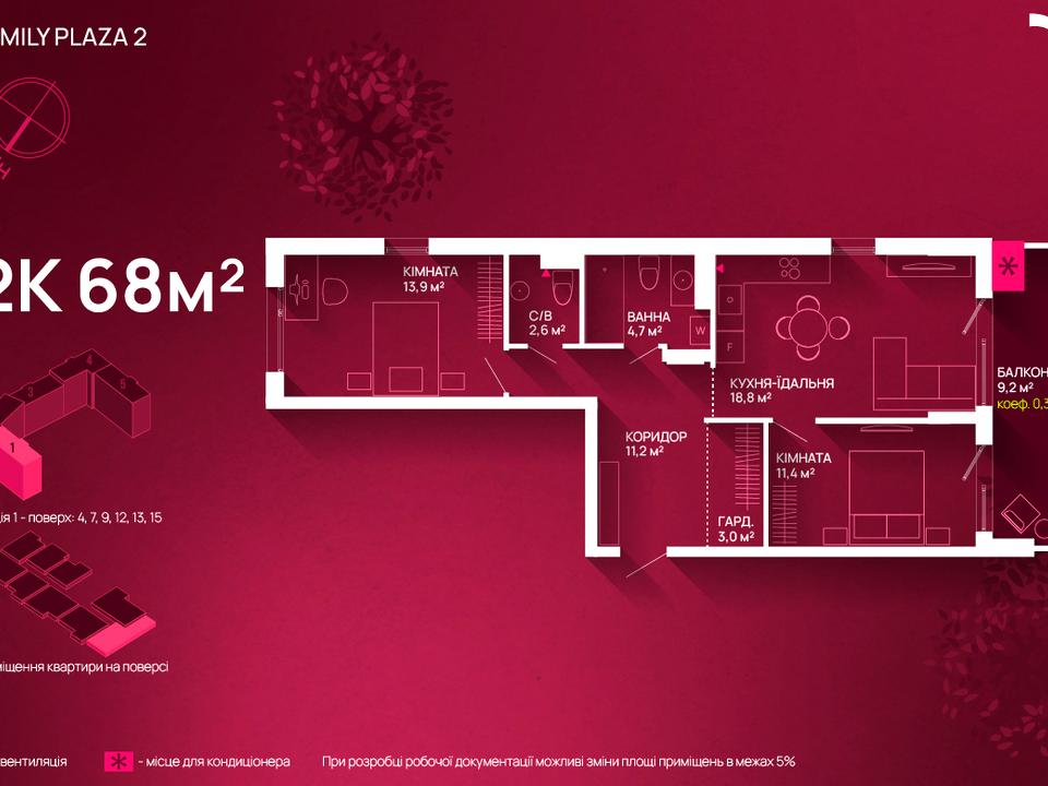 Квартира розташована на 4 поверсі, має зручне планування: кухня-студія, дві окремі кімнати, гардеробна, ванна та санвузол, балкон.
