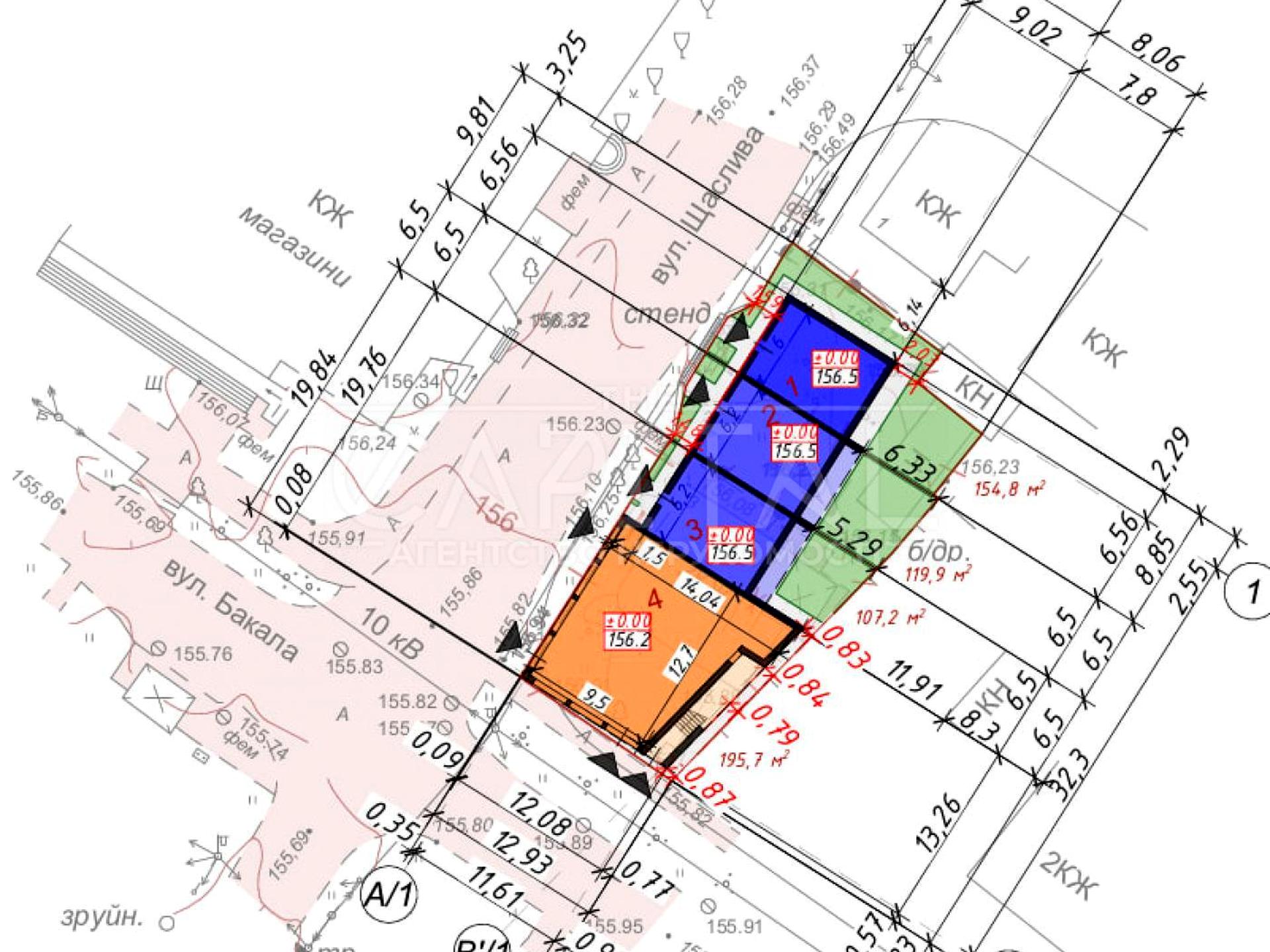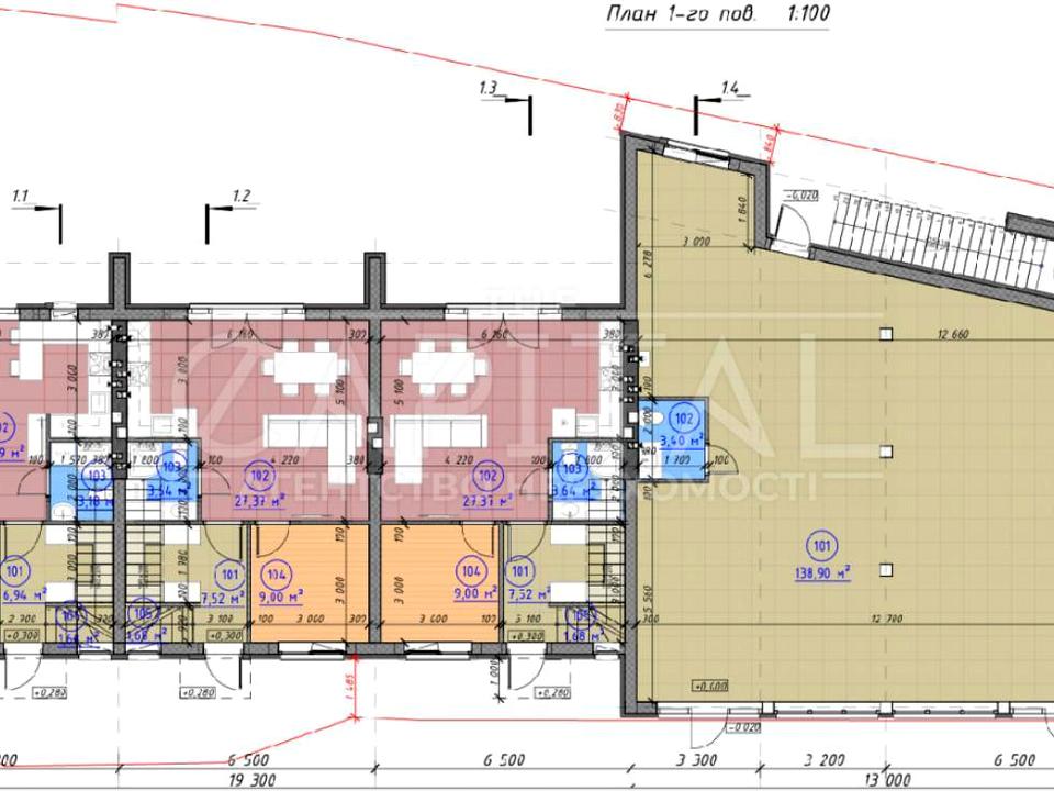 • Загальна будівля складається з 3 таунхаусів і комерційних приміщень (1-й та 2-й поверх).