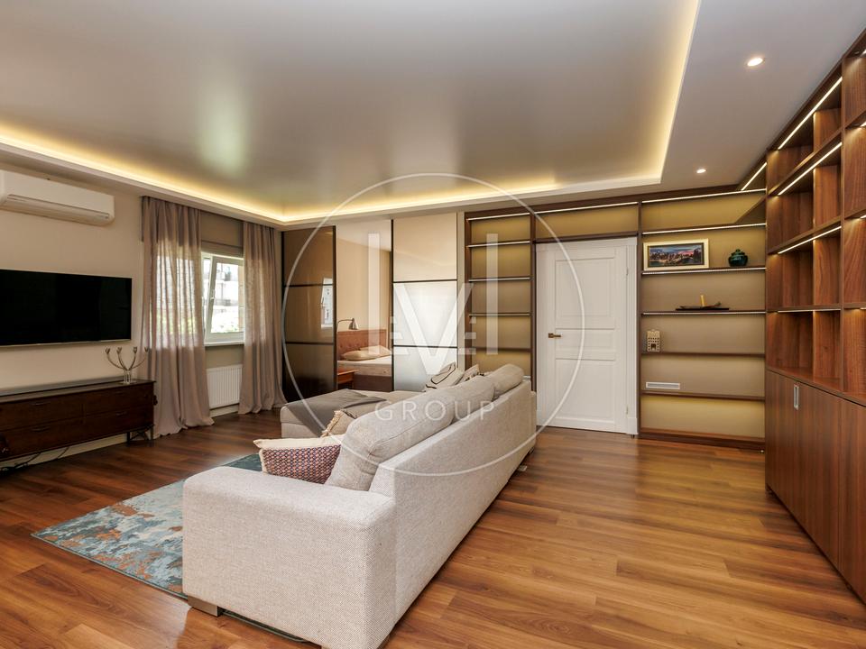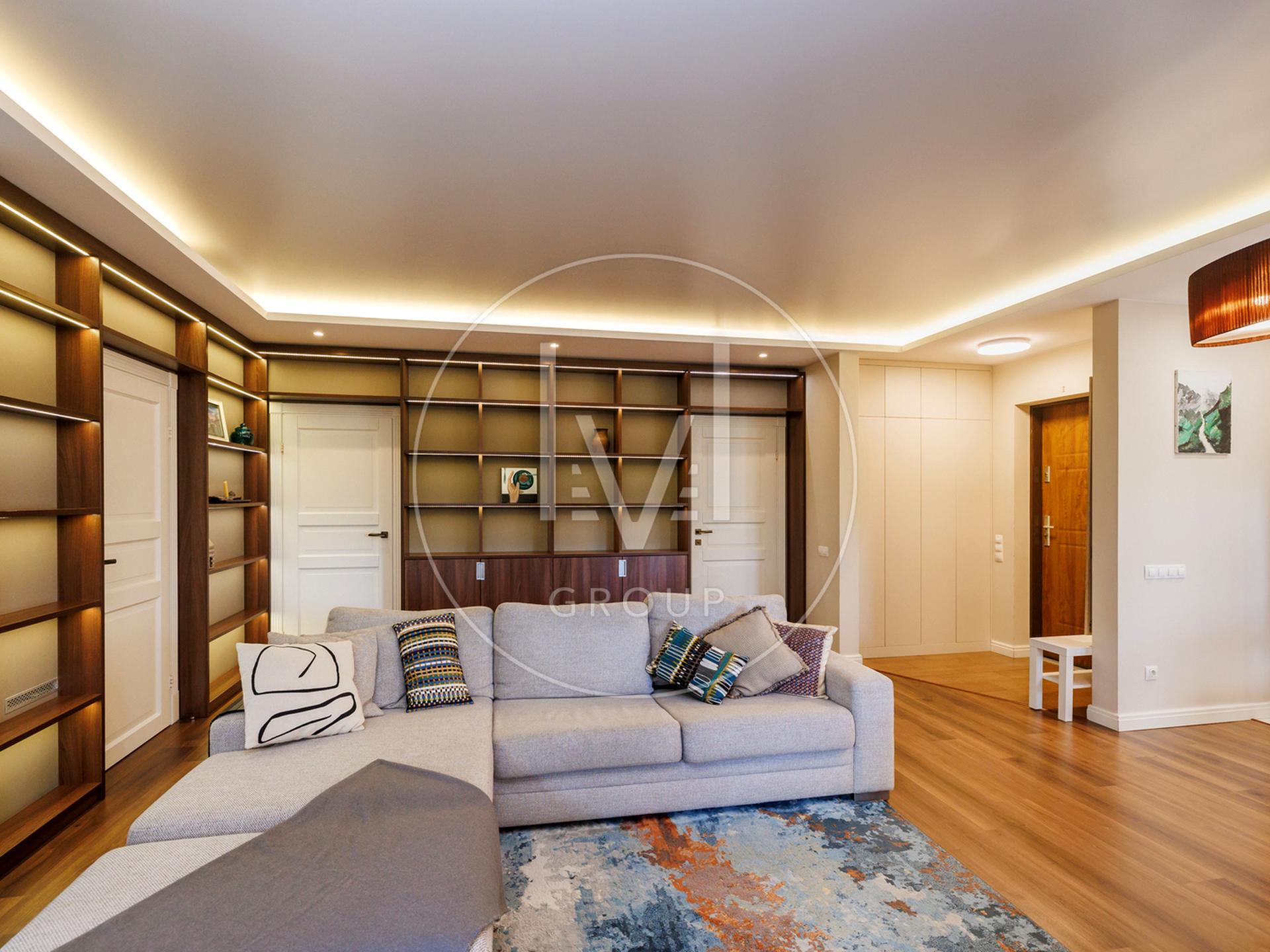 В квартирі дуже якісний ремонт, робили для себе, а тому було використано лише дорогі та якісні матеріали. На підлозі паркетна дошка та плитка, є підігрів підлоги. Багато різного LED освітлення.