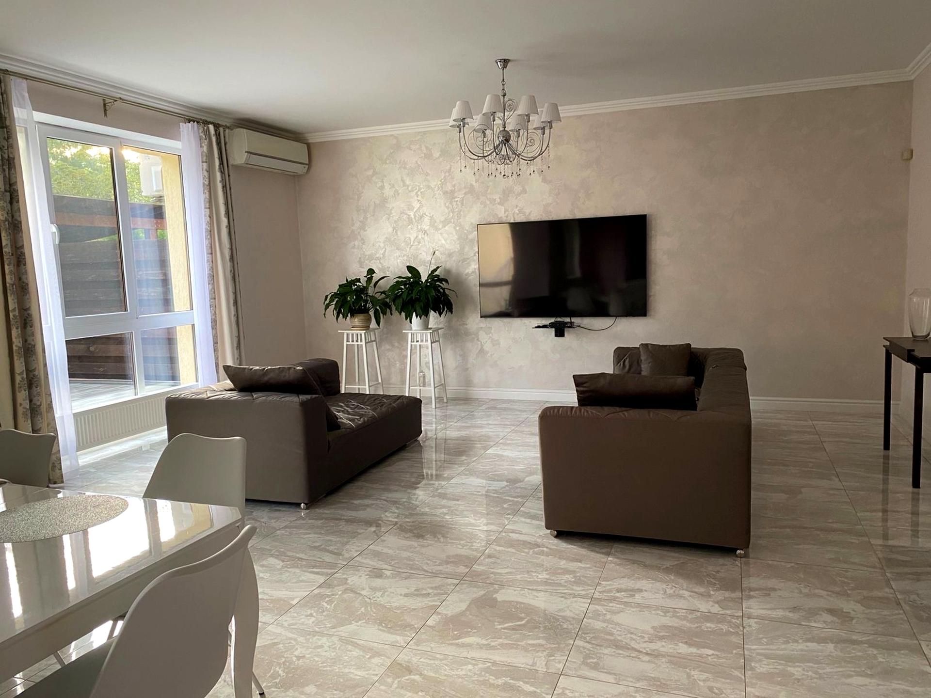 У будинку виконаний сучасний ремонт із якісних матеріалів. Меблі (Італія) та техніка світових виробників: духова шафа Electrolux, ел. поверхня Kaiser, посудомийна машина Ariston. Сантехніка італійського бренду Devit Меблі, двері, сходи виготовлені із натурального дерева. Покриття підлог: плитка (Італія), натуральне дерево. Покриття стін: штукатурка Marmorino, шпалери (Італія).