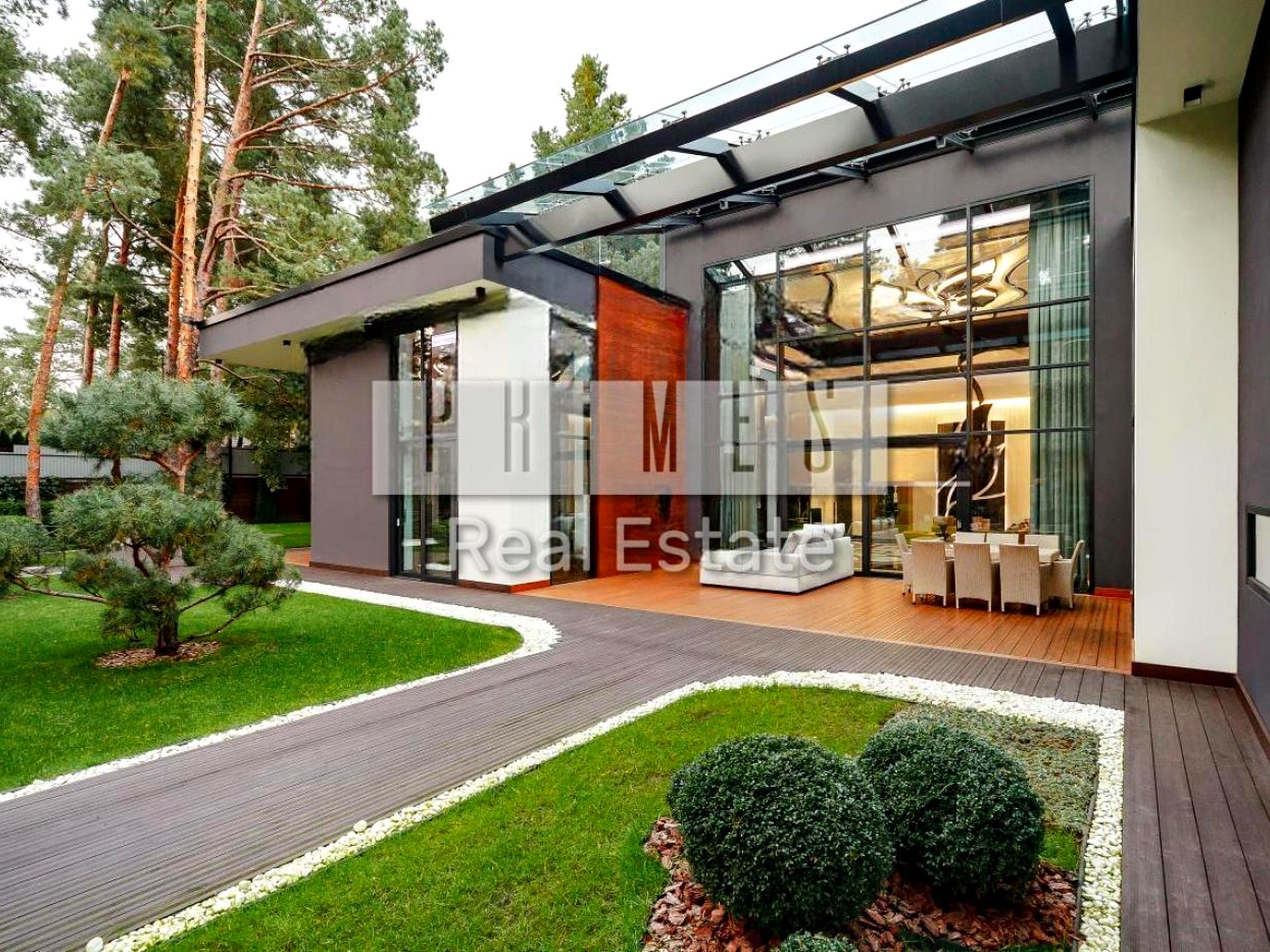 Будинок оформлений у сучасному стилі, мармурові підлоги, шкіряні підлоги, паркет. Двері італійські зі скла фірми Римадезіо, стелі оформлені панелями зі шпону, МДФ.