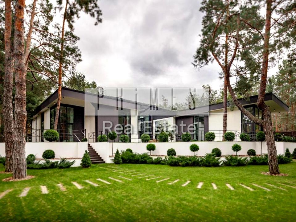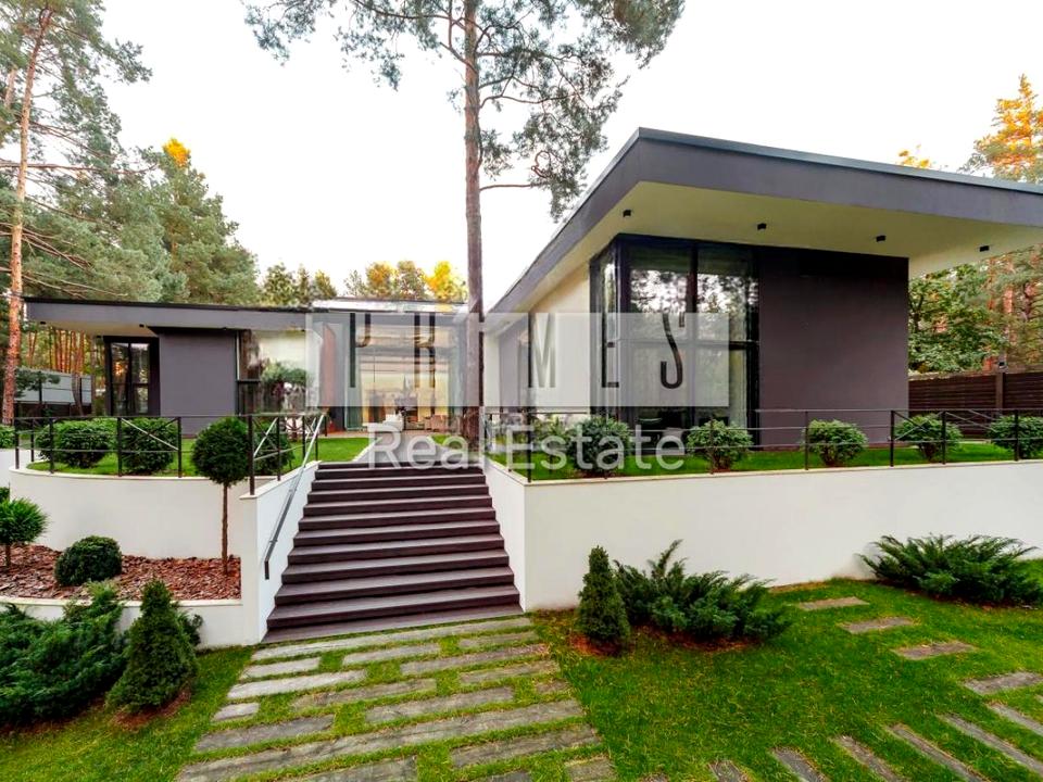 Вітражні вікна виробництва Бельгії Reynaers відкривають прекрасний вид зі спалень та вітальні на вікові сосни та ландшафтний дизайн