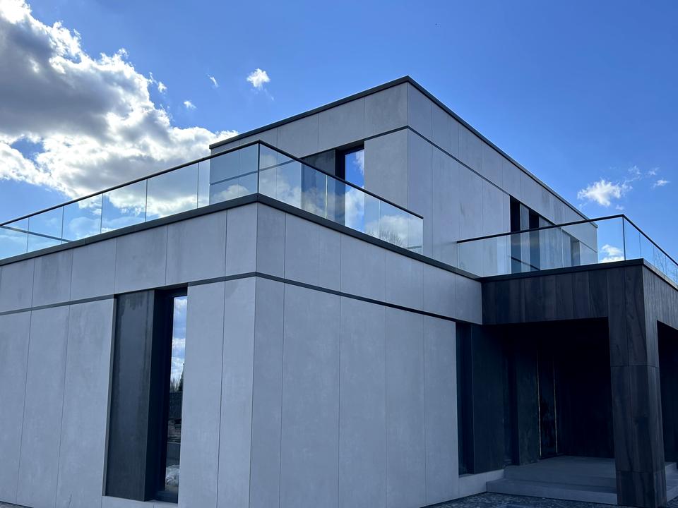 Фасад: Вентильований фасад з утепленням мінеральною ватою (150 мм) та оздобленням широкоформатною керамогранітною плиткою преміум-класу (Іспанія)