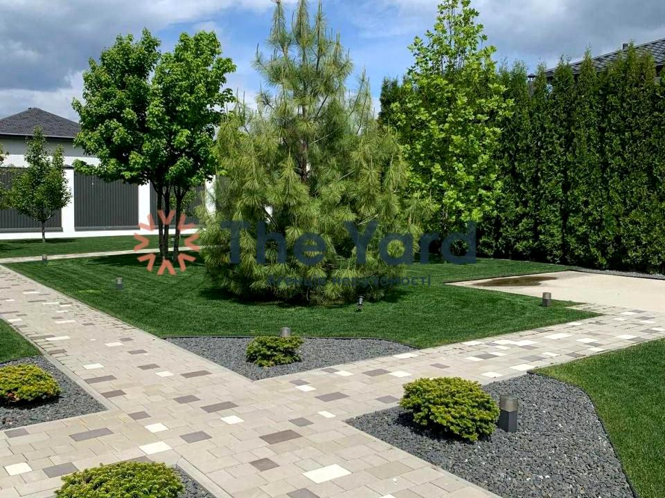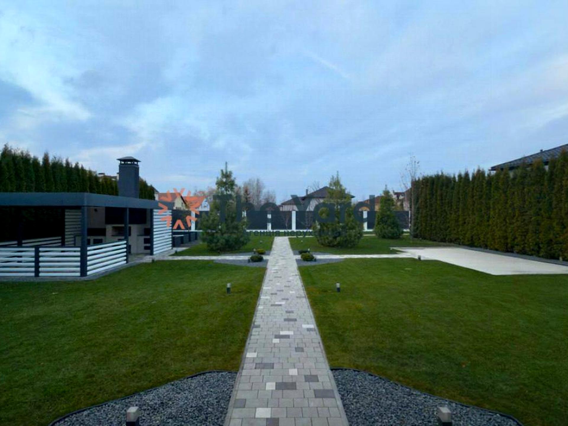 Озеленення виконане повністю, фруктовий сад, декоративний паркан з туй висотою 5 м + 3 м монолітний паркан по периметру.