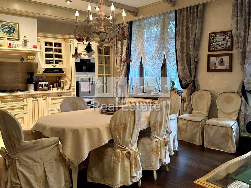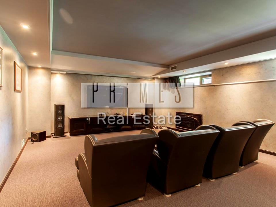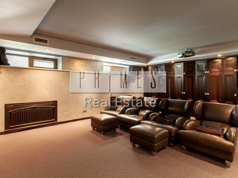 На першому поверсі основного будинку - гостина з камінною зоною, їдальня, кухня, гардеробні, гостєвий с/в, шикарна СПА зона з басейном та сауною та спортзал, кінотеатр. На 2-поверсі - 3 спальні зі своїми с/в і туалетами, кабінет або гостинна спальня, с/в, велика кімната. У цоколь – гараж на 4 авто, тех.приміщення. Є генератор. Дизайн виконано у класичному стилі, дизайнерська меблі, дорога сантехніка, світильники та люстри-кристалі. У 5 хвилинах їзди яхт-клуб.