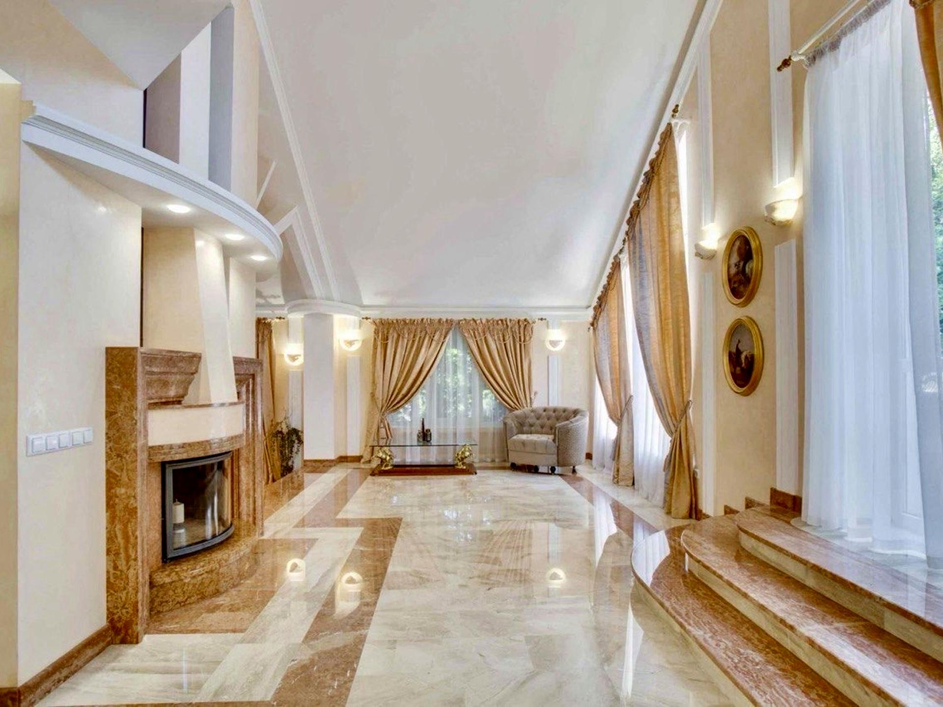 Вітальня з каміном, кухня з зоною їдальні та виходом у зимовий сад та терасу, 5 спалень, 5 с/вузлів, СПА зона з басейном та виходом у сад, винна кімната, котельня, гараж на 3 автомобілі, обладнані зони зберігання.