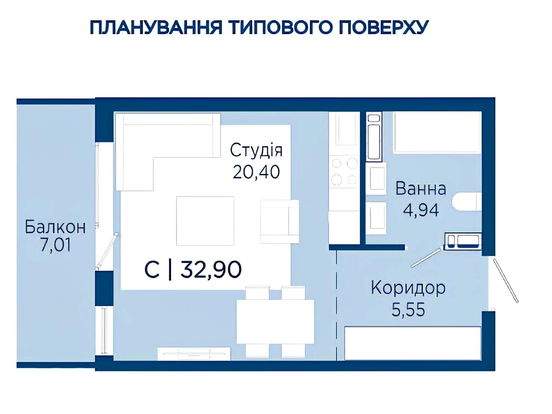 Продається сучасна квартира з просторою кухнею-студією в житловому комплексі від надійного забудовника Вертикаль. Загальна площа становить 32,9 м², з яких 20,4 м² — світла кухня-студія з виходом на балкон. Квартира розташована на 4-му поверсі 10-поверхового будинку. Здача — кінець 2027 року.