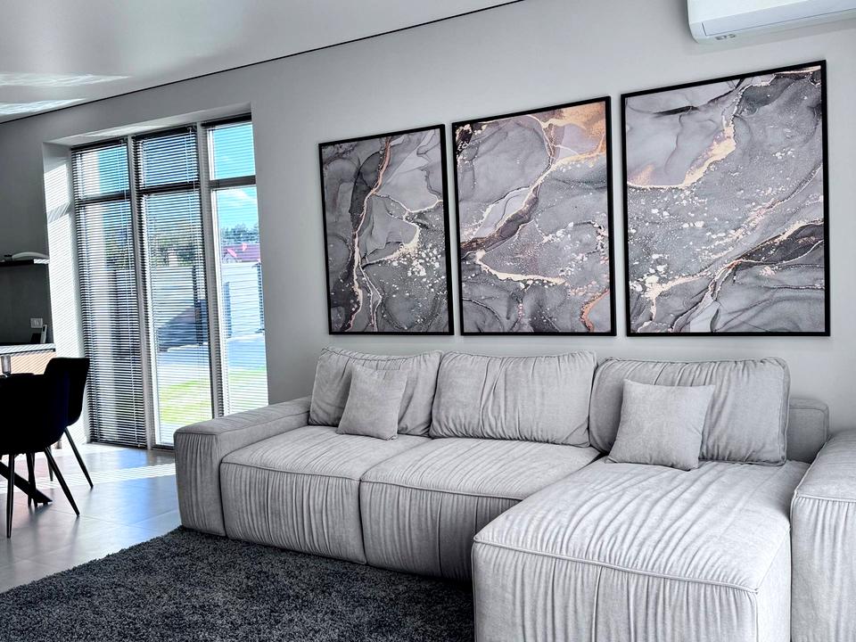 Будинок має продумане комфортне планування, чотири окремі спальні кімнати, три санвузли, велика кухня - вітальня на 44 м2, гардеробні, паливна , та гараж.