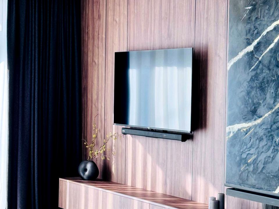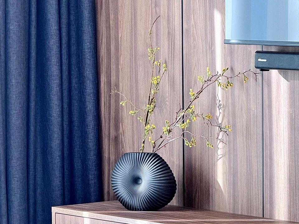 – Зона вітальні: дизайнерський диван , камін, зона TV, великі панорамні вікна