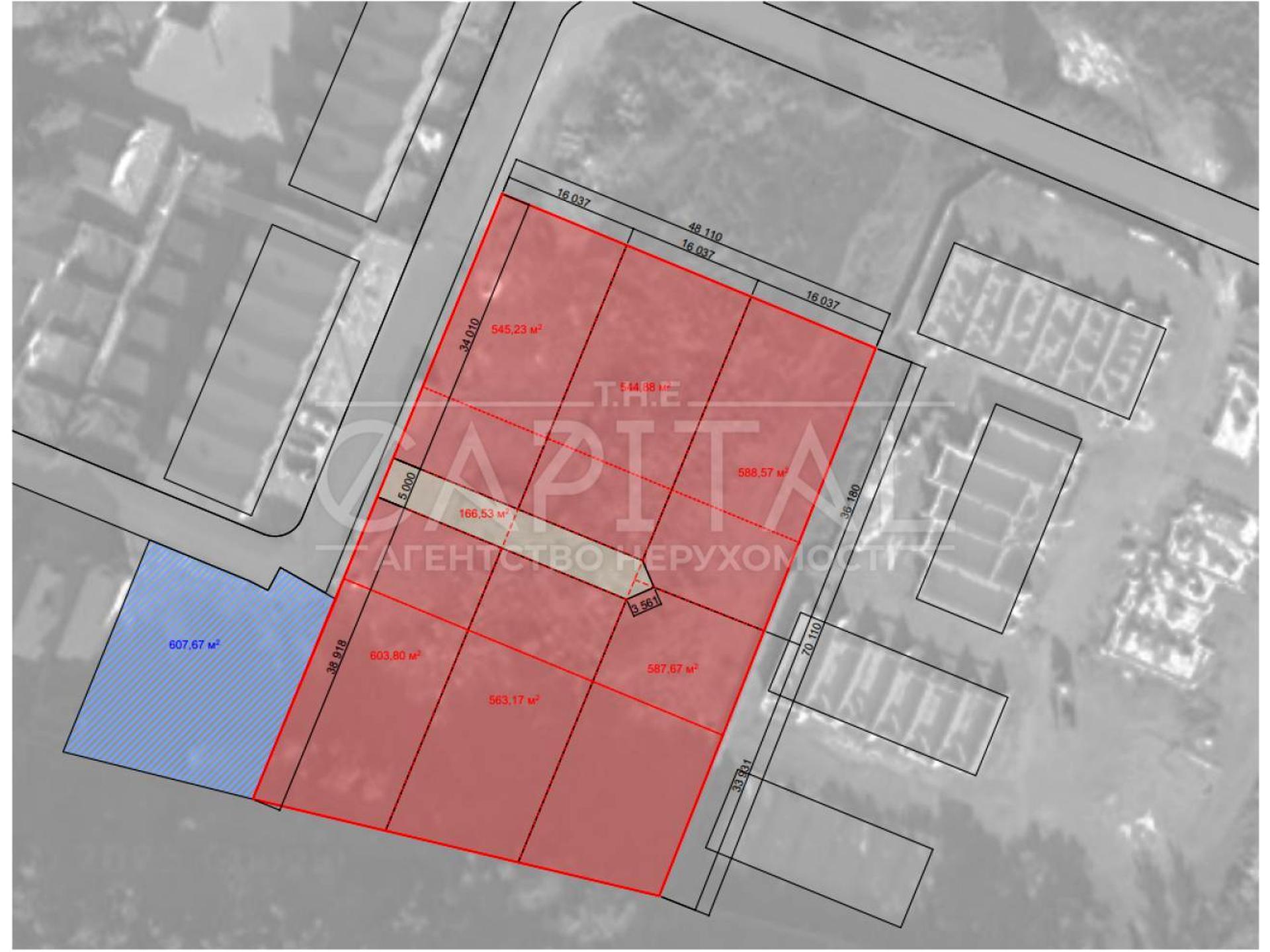 Ділянка вже поділена на 6 участків під забудову Преміальних будинків, можна переділити під Тауни чи Дуплекси.