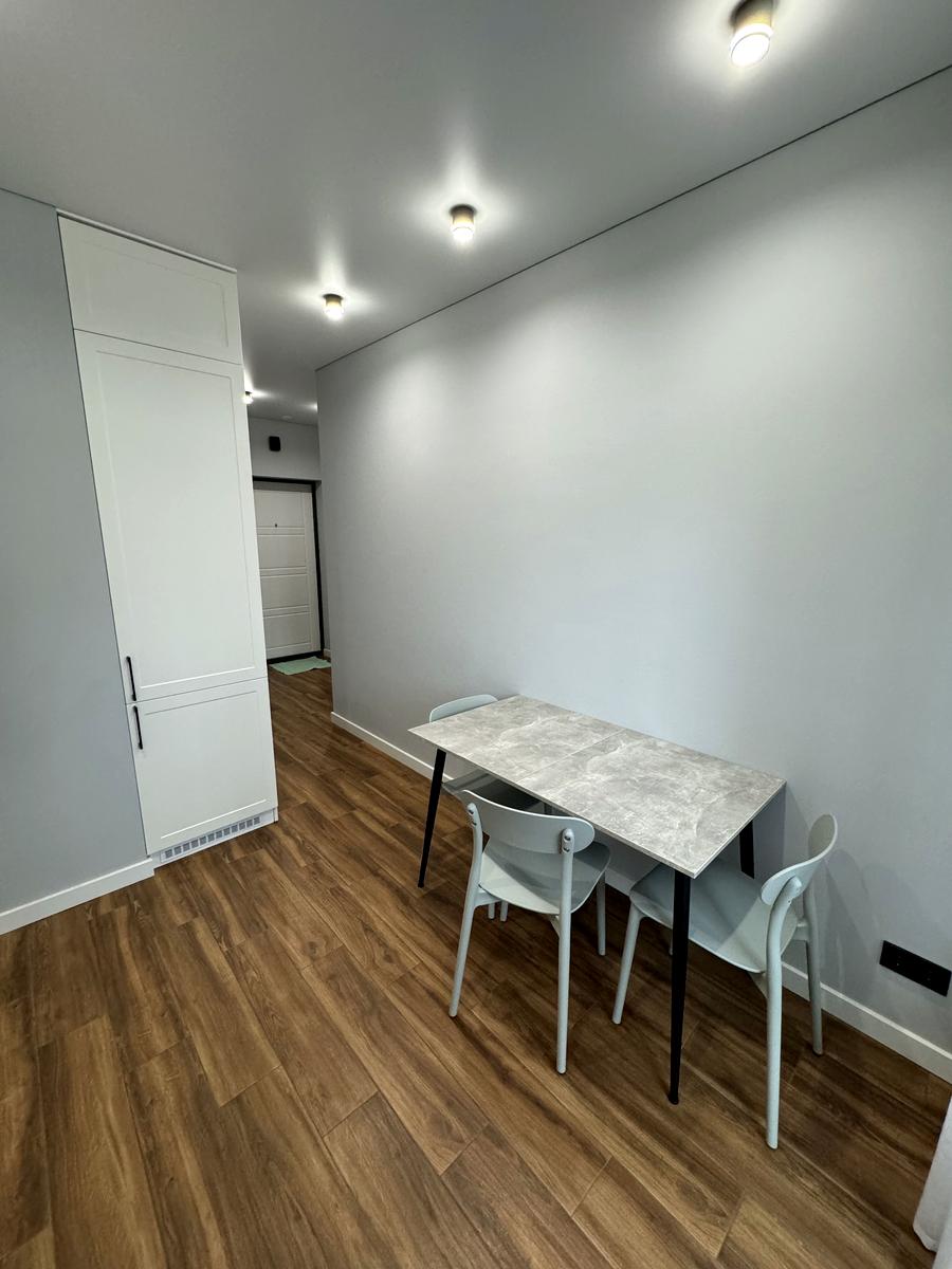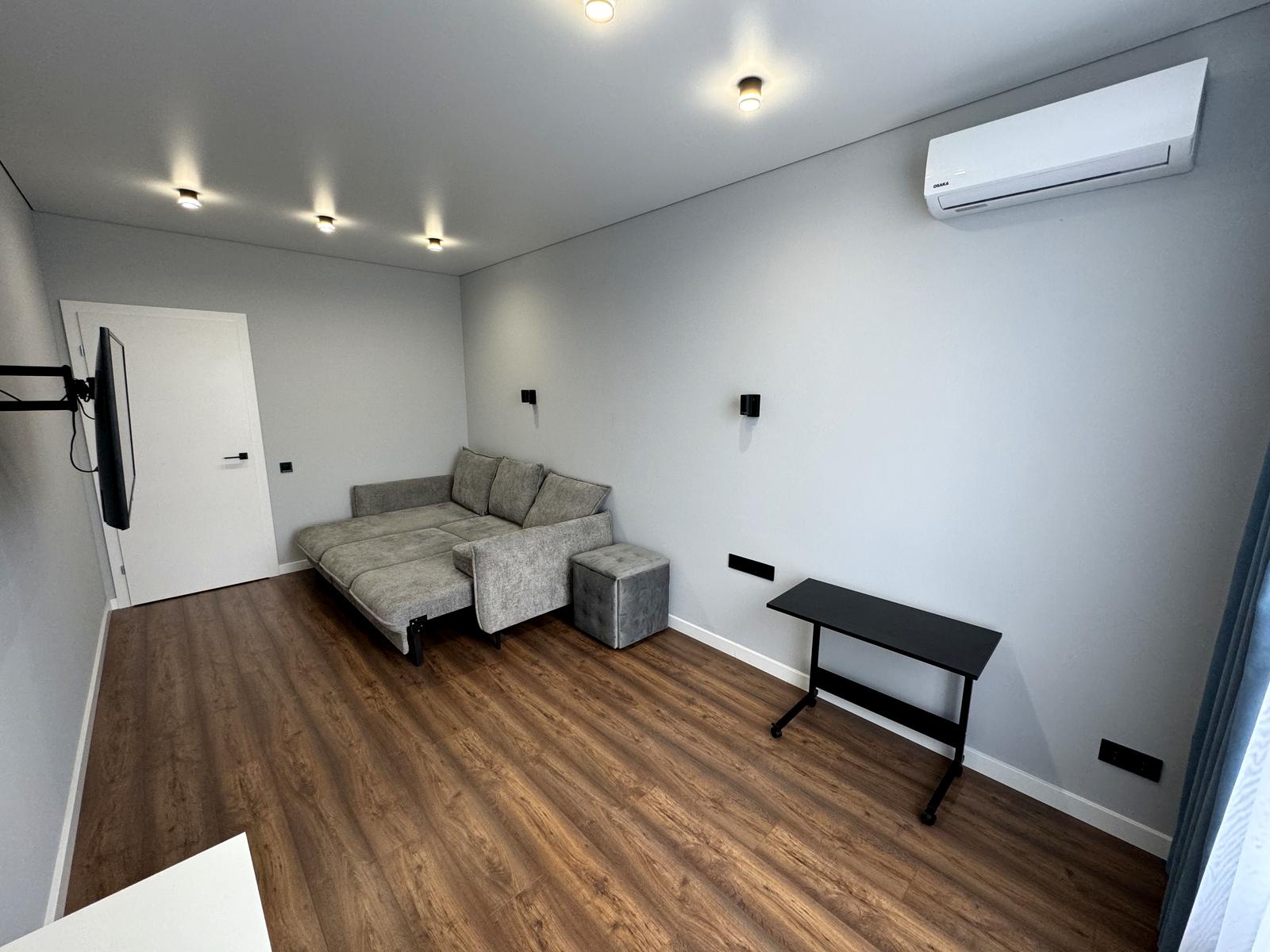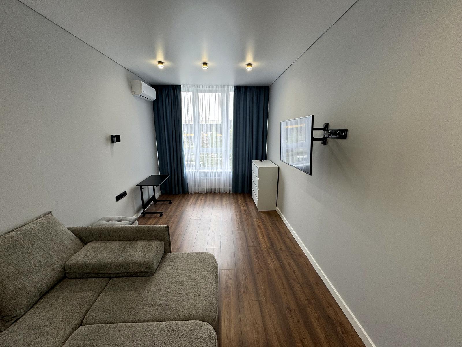 В квартирі 1 кімната. Планування кімнат Роздільне. В квартирі є Телевізор, Праска, Шафа, Холодильник, Пральна машина, Кондиціонер, Лічильники, Душова кабіна, Посудомийна машина. Загальний стан квартири - Перша здача. Працює без світла - вода, опалення, ліфт. Комісія за послуги 50 %