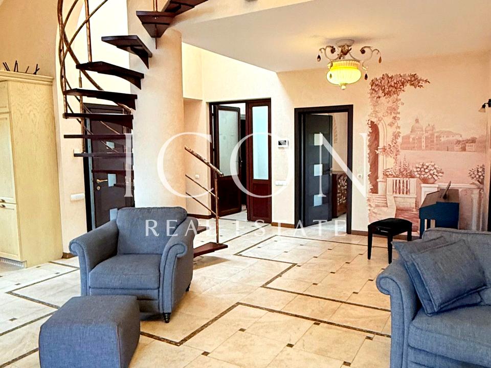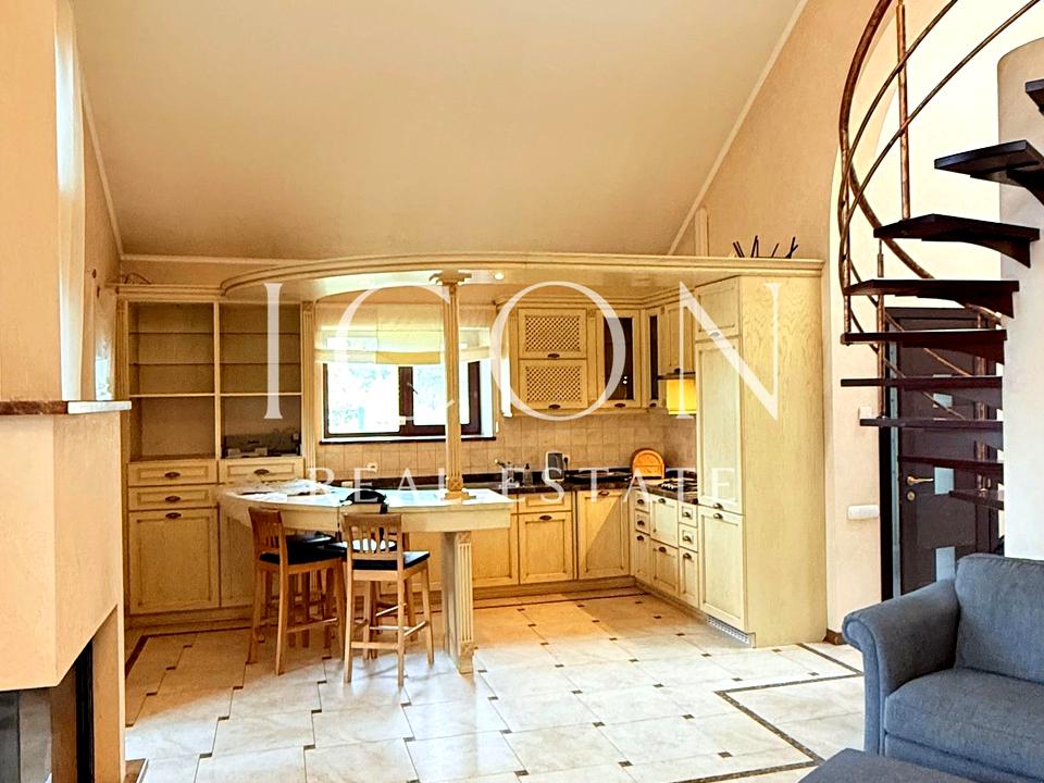 Кухня-вітальня повністю укомплектована технікою Siemens: варильна поверхня (газ, склокераміка), духова шафа з мікрохвильовою та грилем, вбудована кавомашина, посудомийна машина, холодильник Liebherr. Кухня з дерева та шпону, стільниця й підвіконня з натурального мармуру. Є французький камін, який обігріває весь простір.