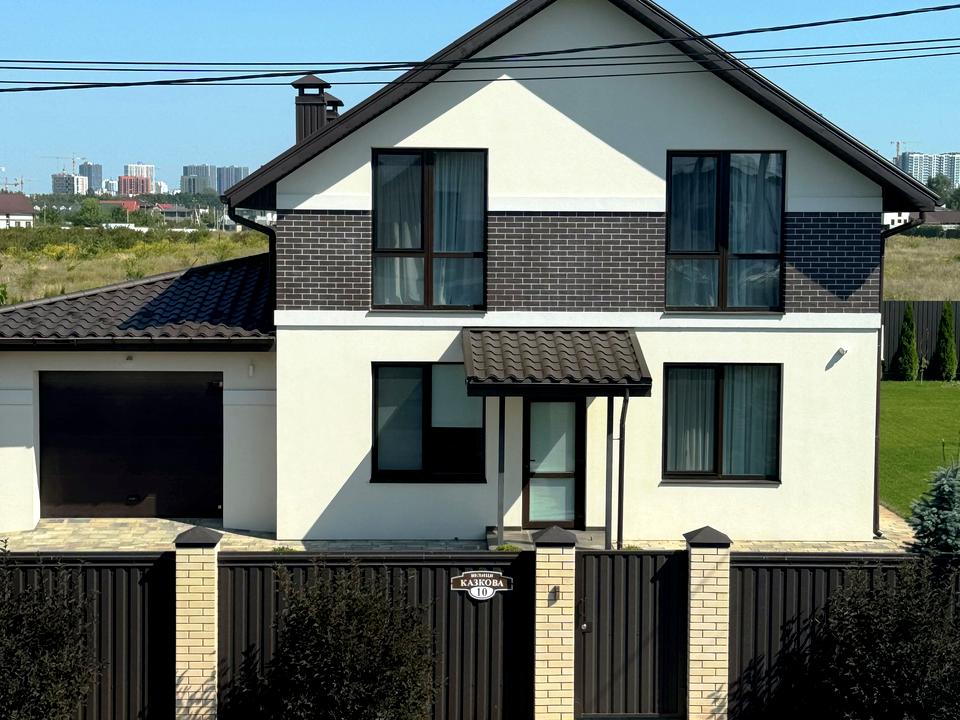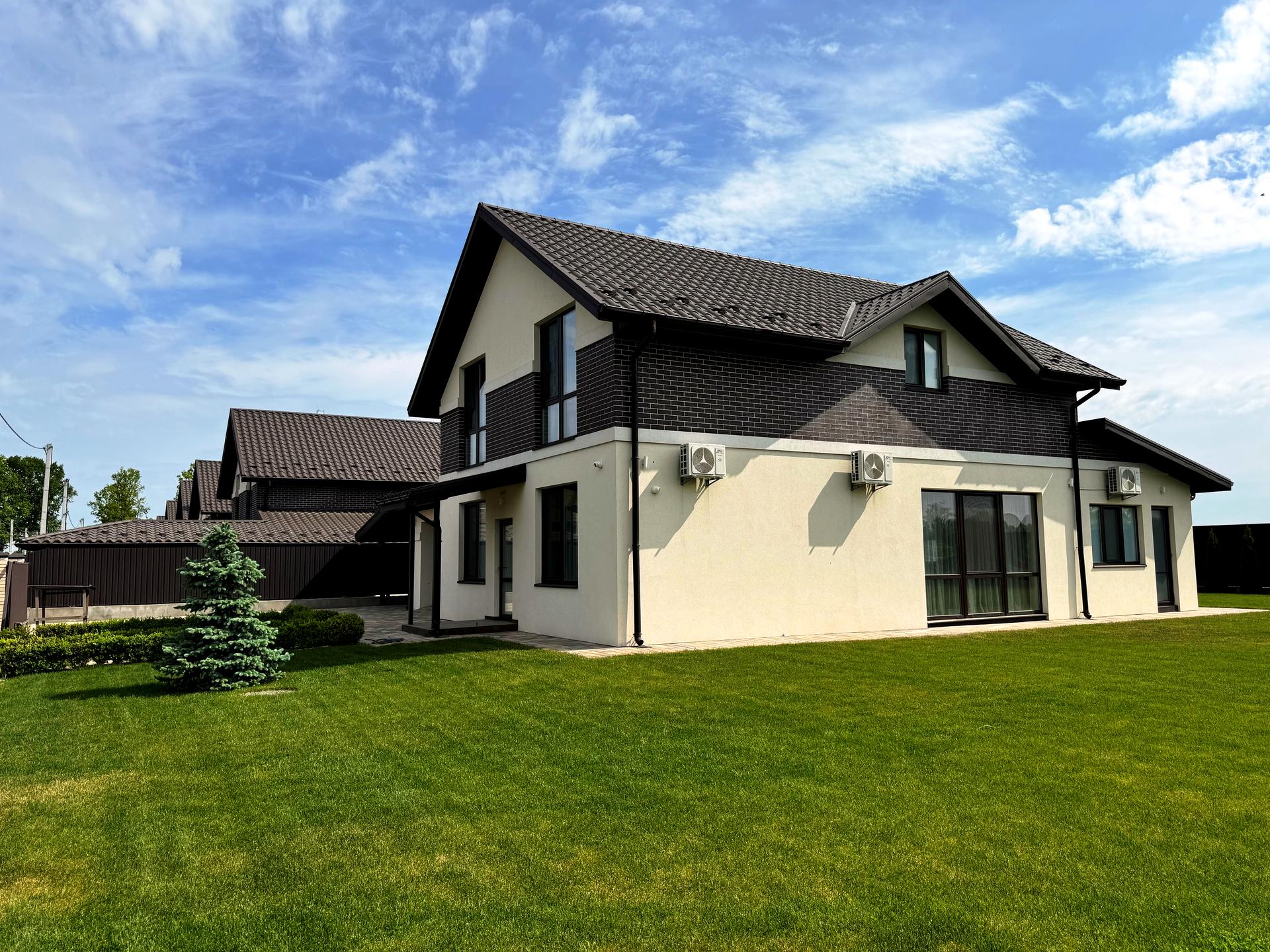 Новий двоповерховий будинок з ремонтом та меблями площею 255 м.кв. на земельній ділянці 14 соток в затишному місці с. Крюківщина в закритому котеджному містечку.
