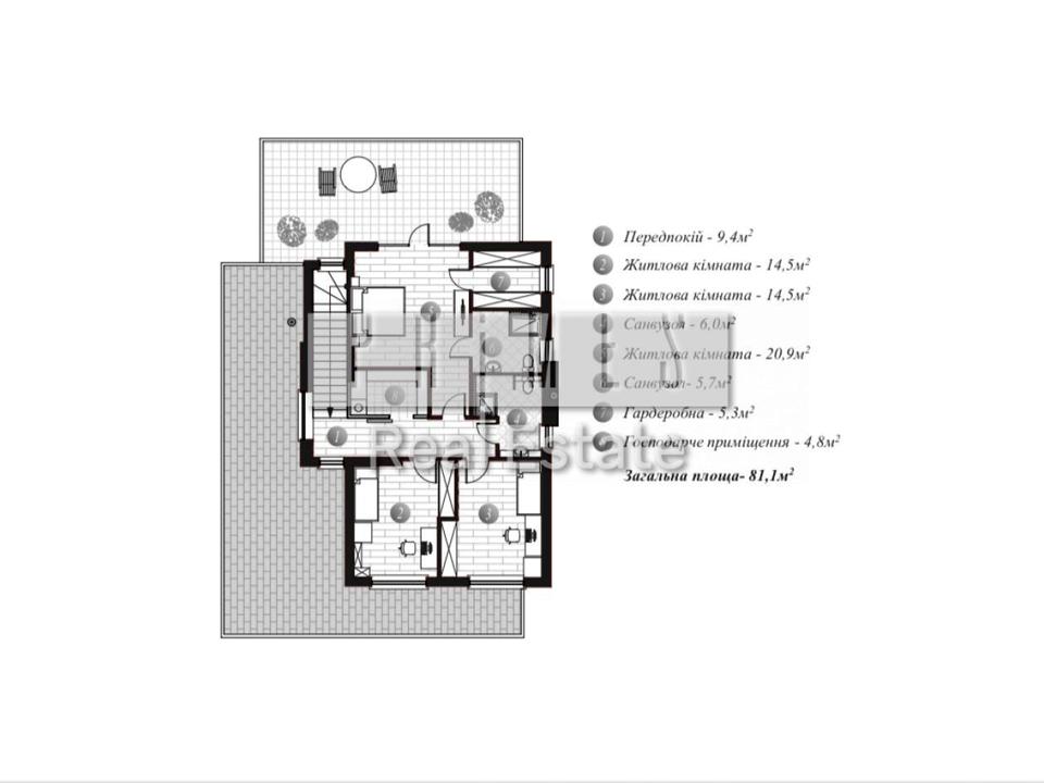 • Розумне планування з просторою вітальною, 3 спальнями, кабінетом та террасою для приємного відпочинку.