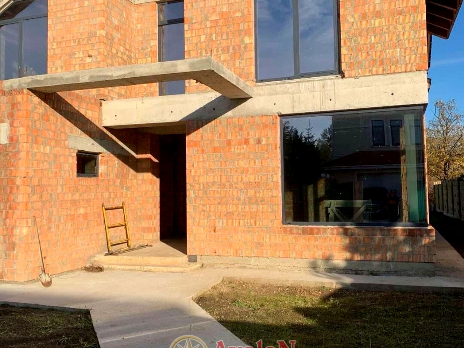На территории есть бассейн (вылита бетонная чаша, подведены все коммуникации). Дом построен из двойного керамического кирпича. Крыша - керамочерепица Creaton Optima Nuance антрацит, панорамные 2х-камерные алюминиевые окна Aluprof.