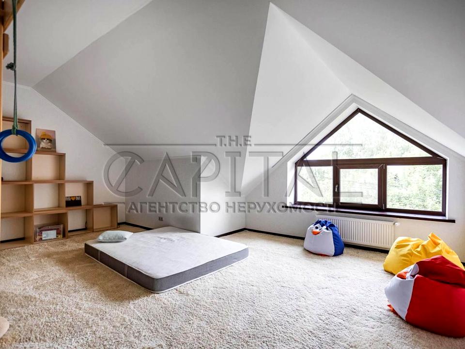 У будинку 4 спальні, кожна зі своїм санвузлом та гардеробною, кабінет з виходом на терасу, велика вітальня з другим світлом та каміном, повністю обладнана кухня та їдальня з виходом на видову терасу, дитяча ігрова, гостьова кімната, спортзал, сауна, гараж.