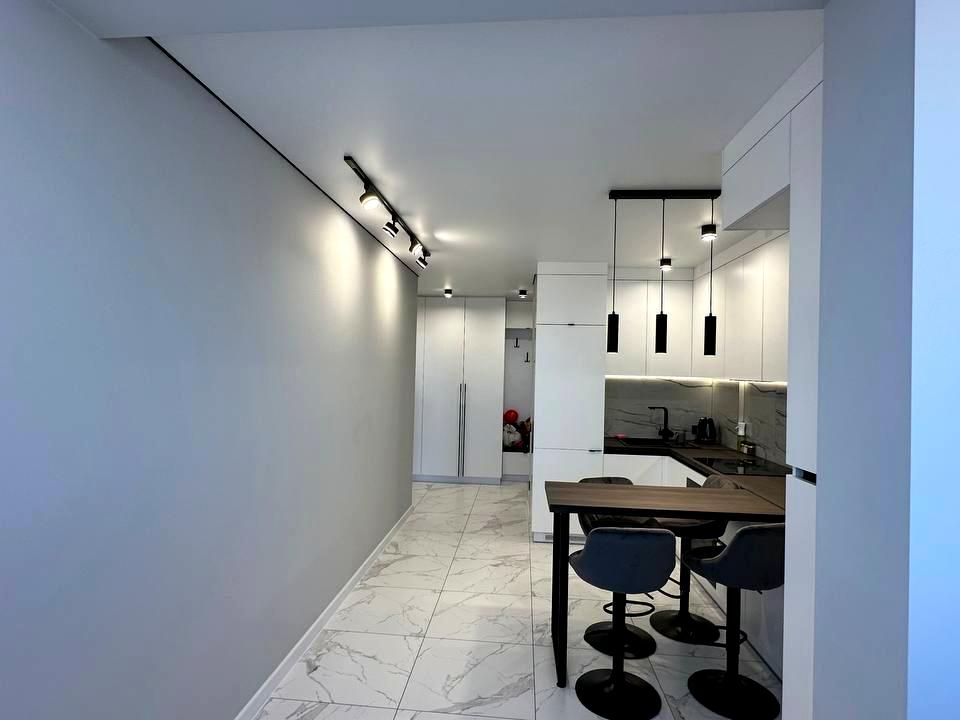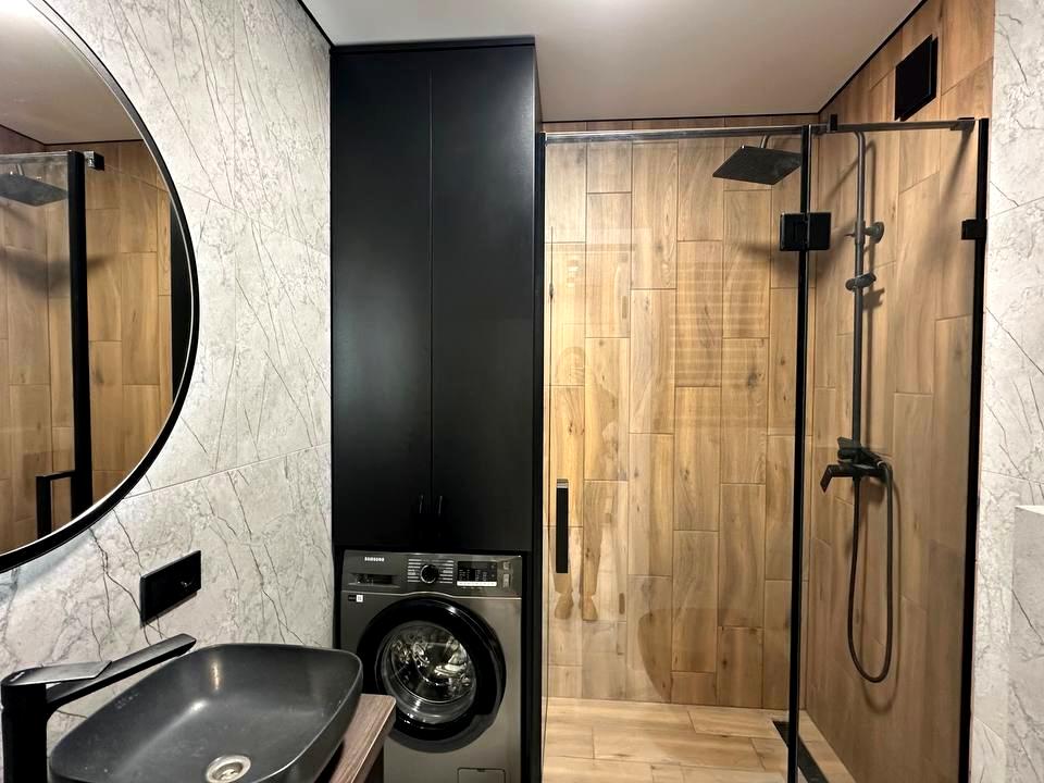 В квартирі 1 кімната, висота стелі 2.75 метра, Технологія будівництва - Монолітно-каркасна, Тип будинку - Спец. проект. Є газ, кухонна плита електрична. Є балкон. У квартирі є Телевізор, Кабельне ТБ, Підігрів підлоги, Кондиціонер, Пральна машина, Душова кабіна, Холодильник, Мікрохвильовка, Посудомийна машина. Будинок побудований в 2021 році. Загальний стан квартири - З ремонтом. Гаряча вода - газовий котел. Кількість санвузлів: 1. Інтернет оптоволоконний. Тип кухні - кухня-студія. Кількість спален: 1. Комісія за послуги 100 %