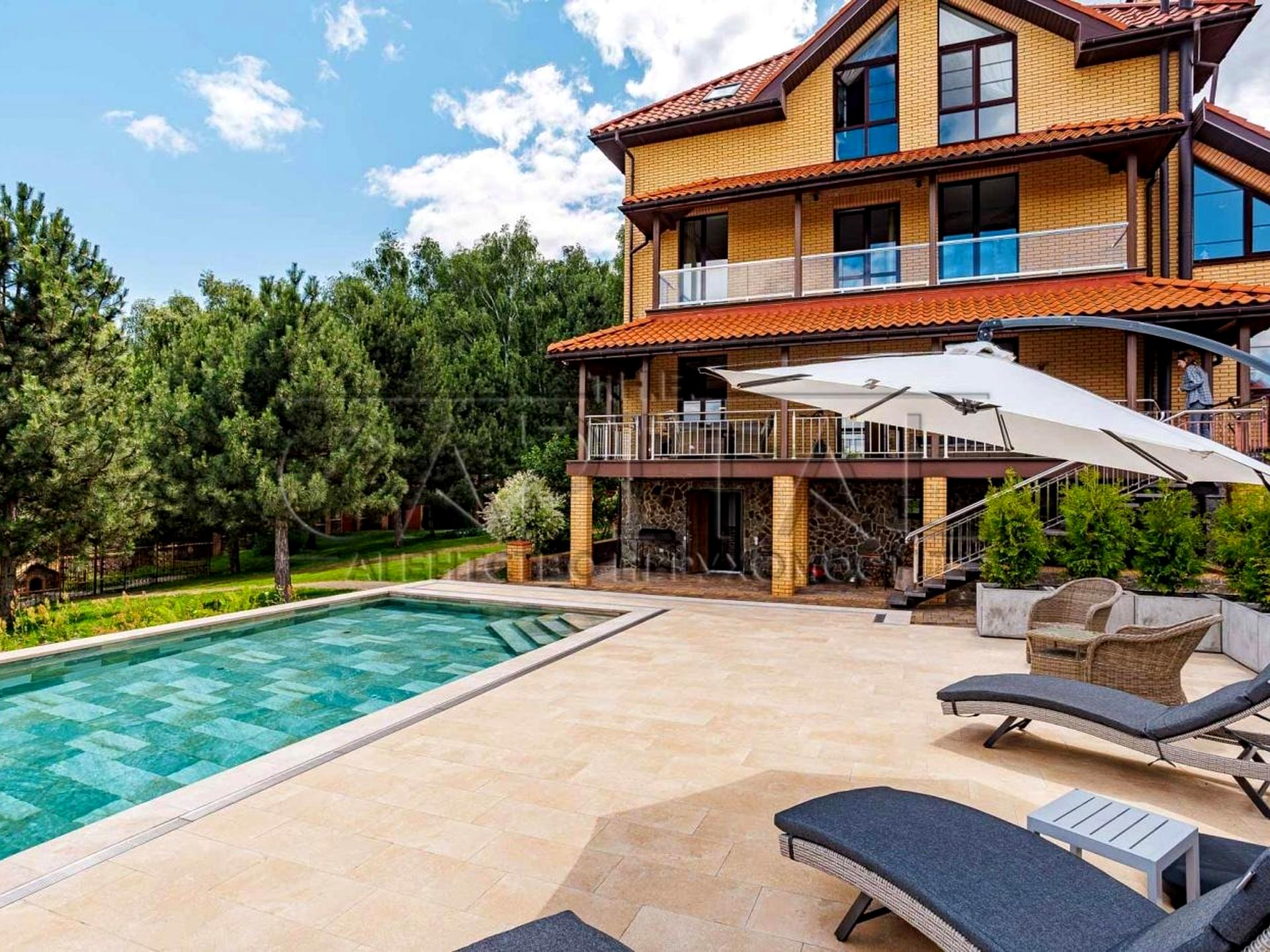 Гостьовий будинок: двоповерховий, із фінською лазнею, турецьким хамамом, басейном із гідромасажем, каміном, опаленням (газовий або електричний котел на вибір).