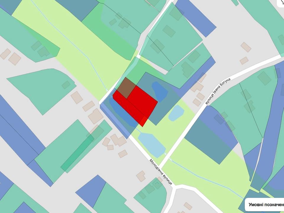 Ділянка розташована в гарному, спокійному місці. Є два під'їзди з різних сторін. Світло, газ поруч. З половини ділянки зроблено ставочок , який живеться із струмка, що протікає обабіч ділянки, друга частина може бути використана під будівництво будинку. Загорожено.