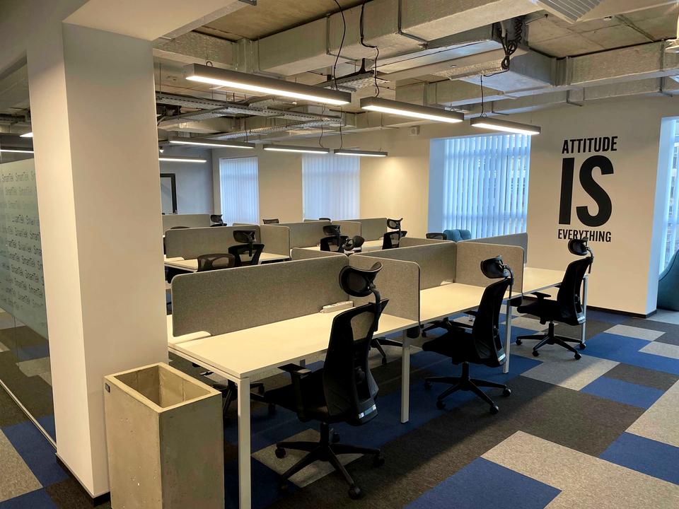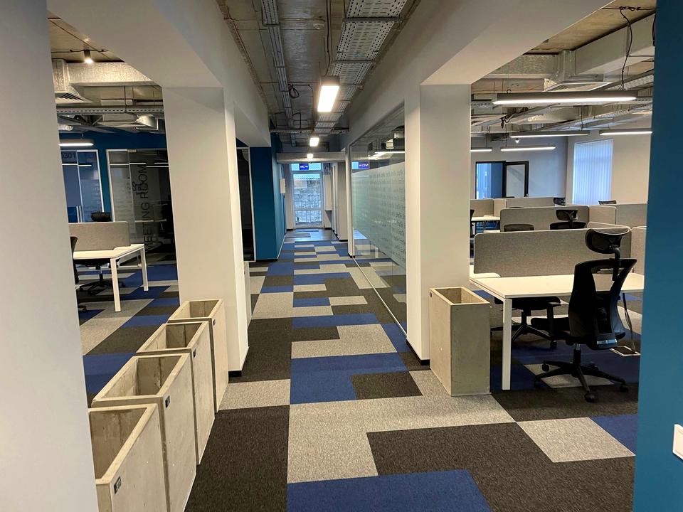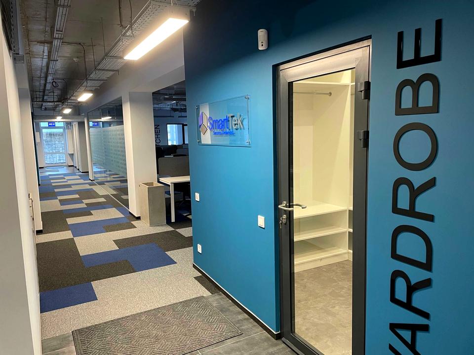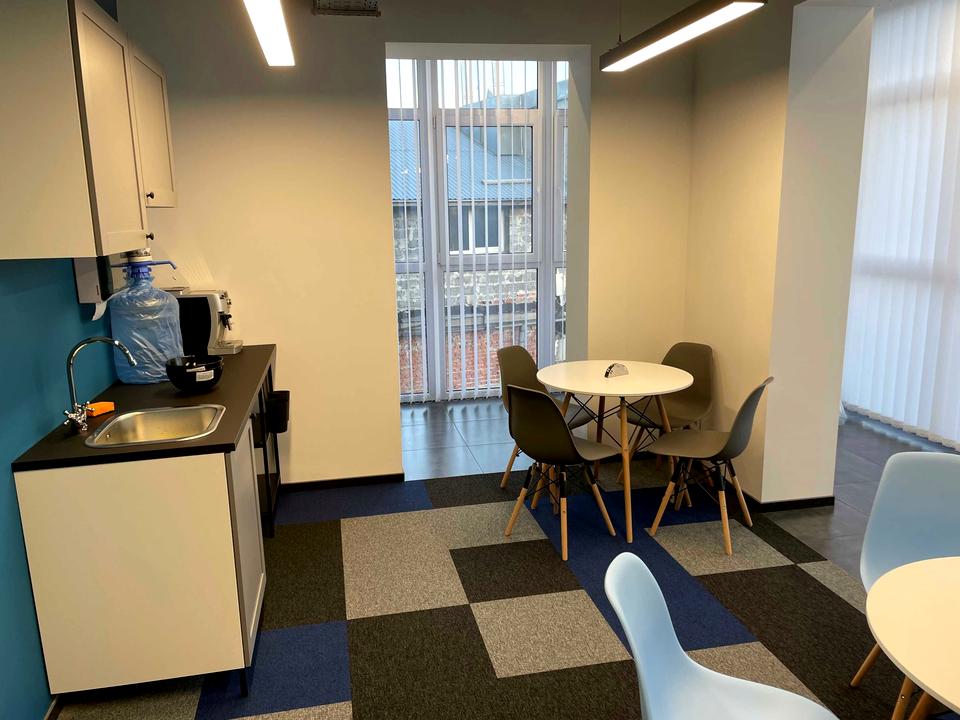 Складається із 2-ох зон, опен спейс, декілька перегородок, кухня, санвузл, та гардеробна. Обладнаний системою охорони Ajax, картковим доступом, оптоволоконним інтернетом.