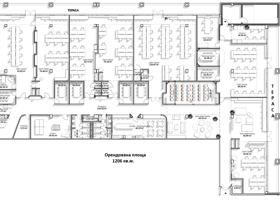 Офіс 1206 м.кв. на 4 поверсі, планування - ресепшн, кабінети/переговорні /скайп-руми + опен-спейси, тераса , кухня, санвузли, серверна.
