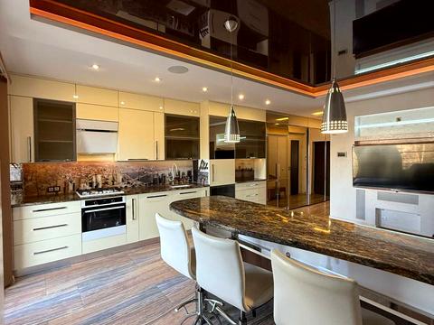 Кухня-студія облаштована якісною технікою (електрочайник, праска, 2 телевізори, пральна/сушильна та посудомийні машини, духова шафа, мікрохвильова піч, кондиціонер), є острівок з барними кріслами. У відпочинковій зоні поставлено журнальний столи...