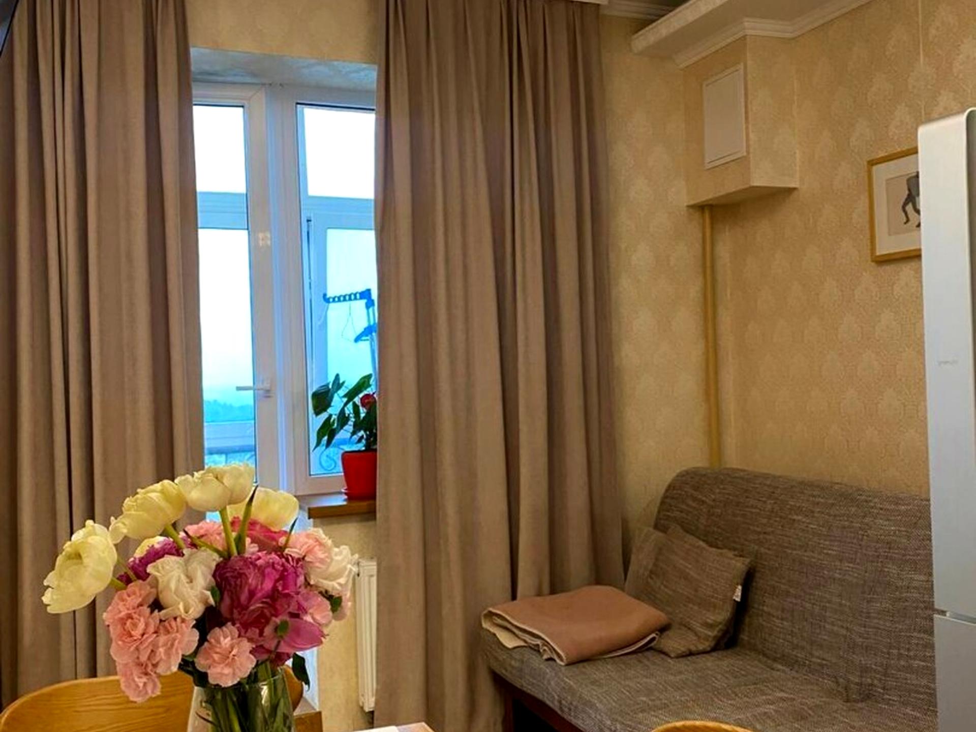 Світла кухня з виходом на засклений балкон, панорамні вікна відкривають гарний краєвид на місто. В спальні та в коридорі розташовані великі шафи-купе для зберігання речей.