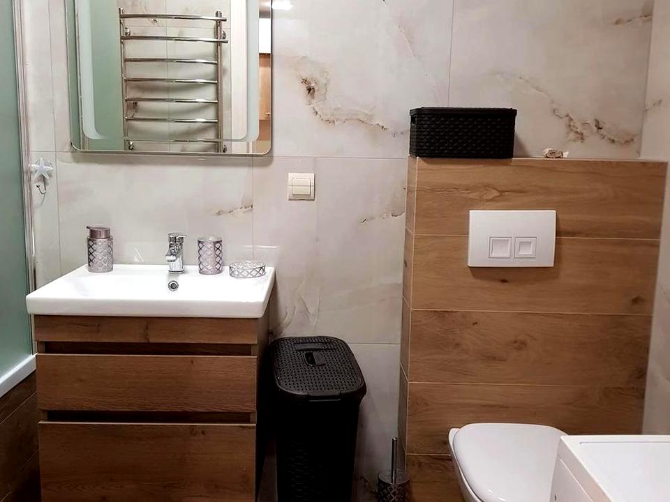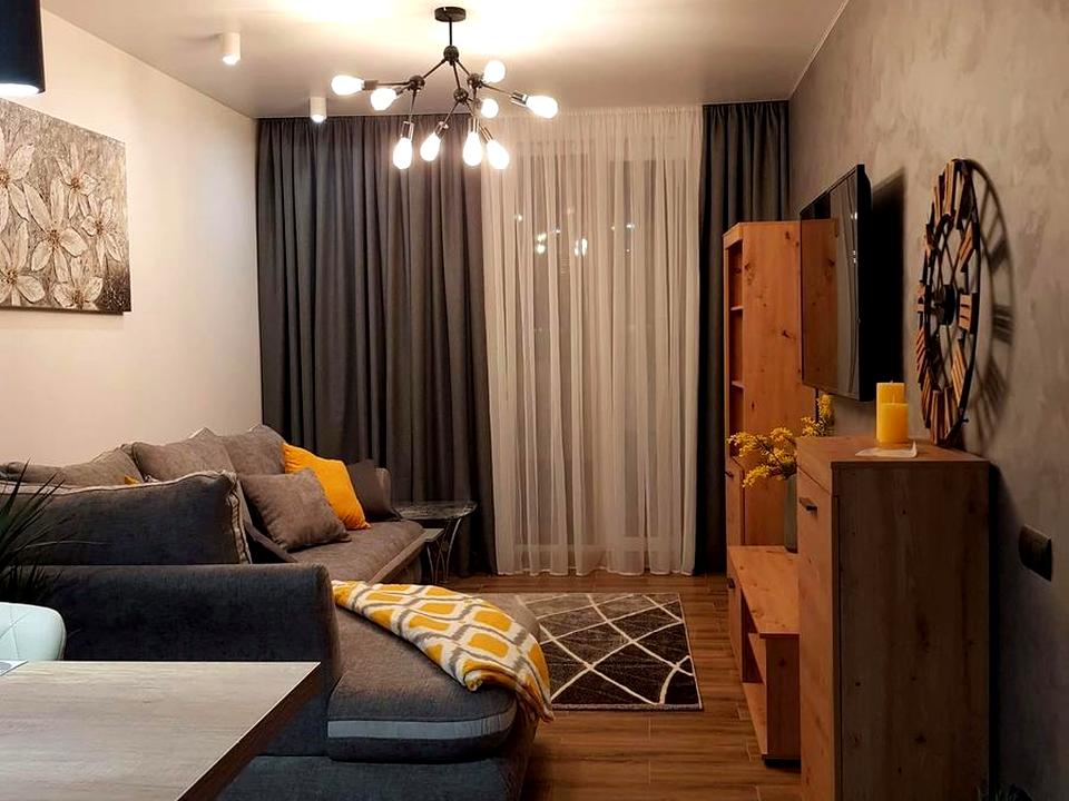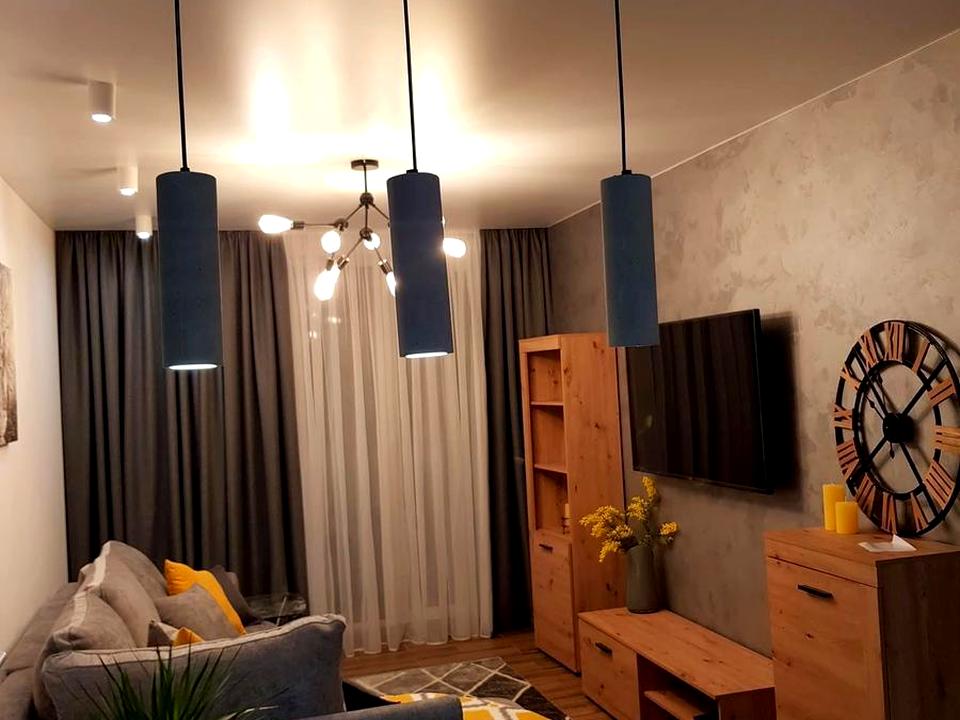 Простора однокімнатна квартира та кухня студія, площа 52 м. Стан квартири якісний, інтер’єр виконаний у стриманих теплих відтінках з акцентом на дерево та м’які текстури. Планування продумане, освітлення зоноване.
