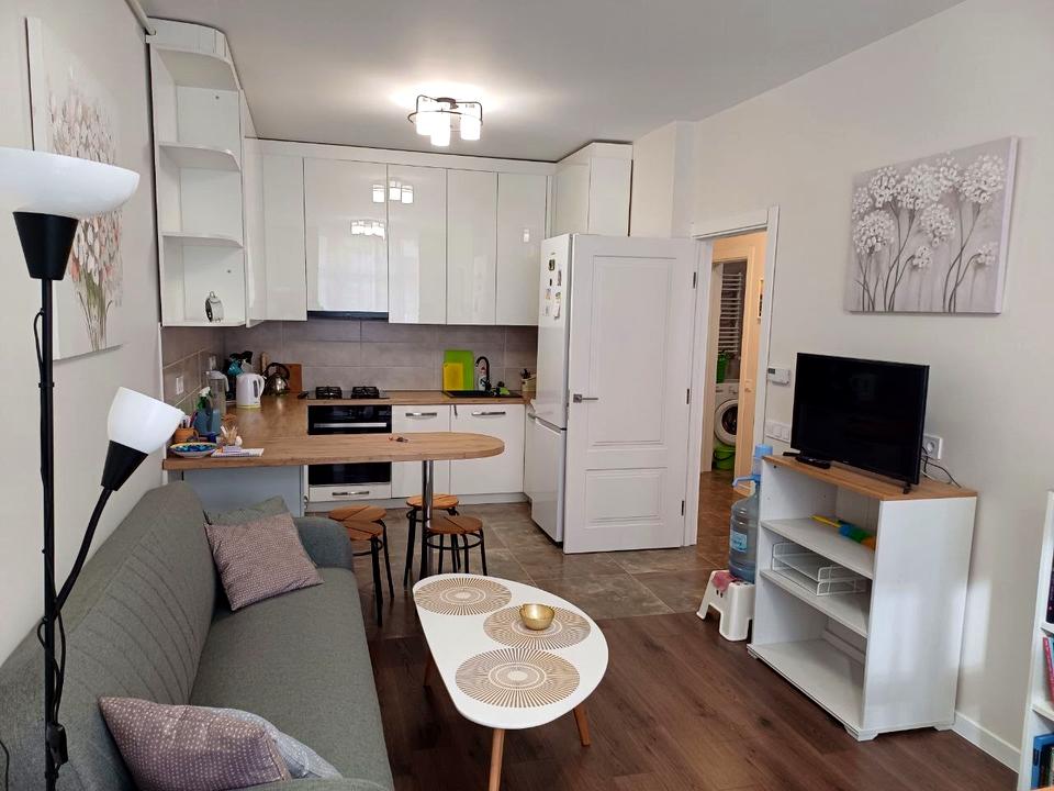 • вітальня-кухня із зоною відпочинку, диваном, телевізором і барною стійкою