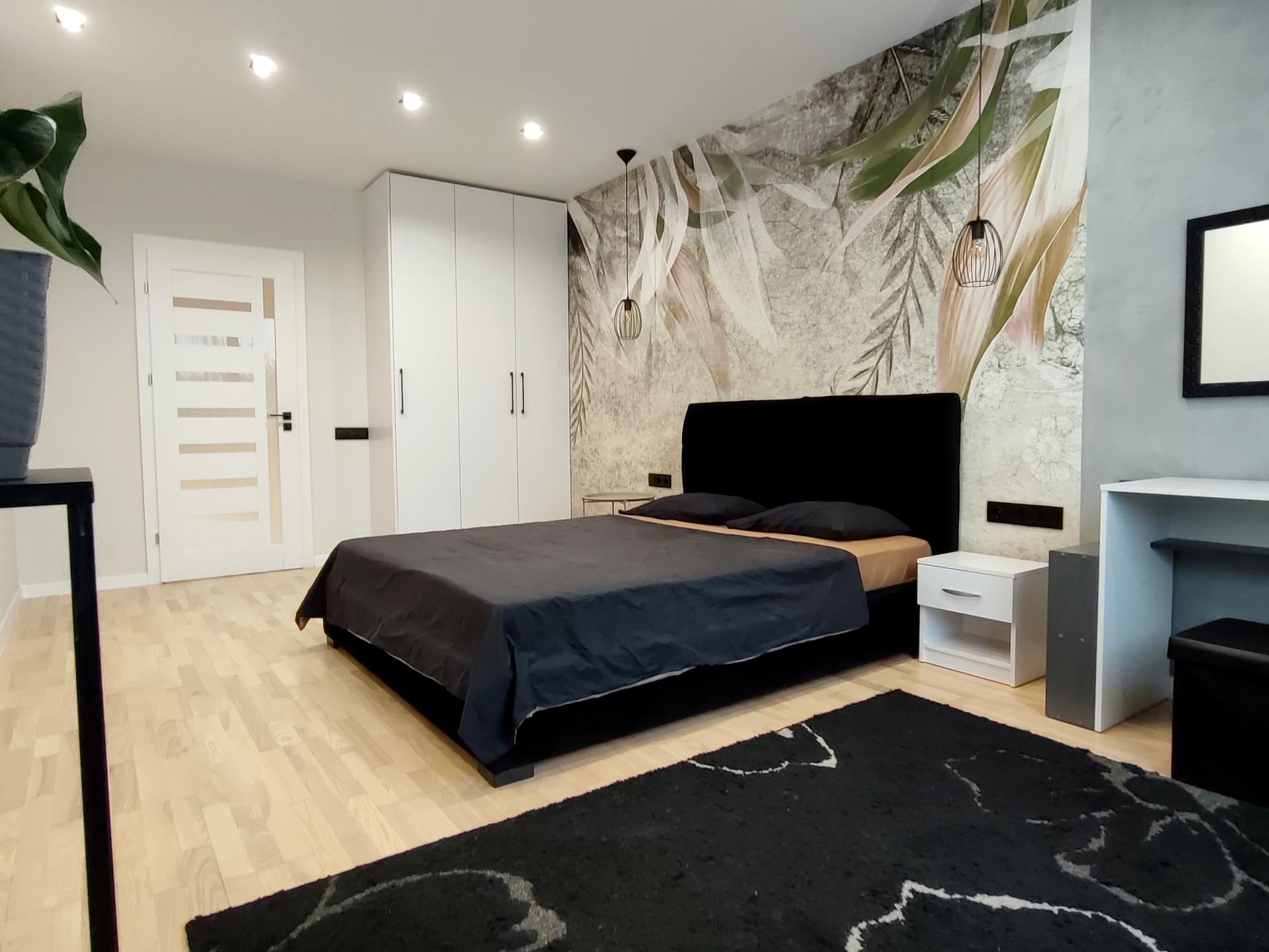 В спальні королевське велюрове ліжко, паркетна дошка)