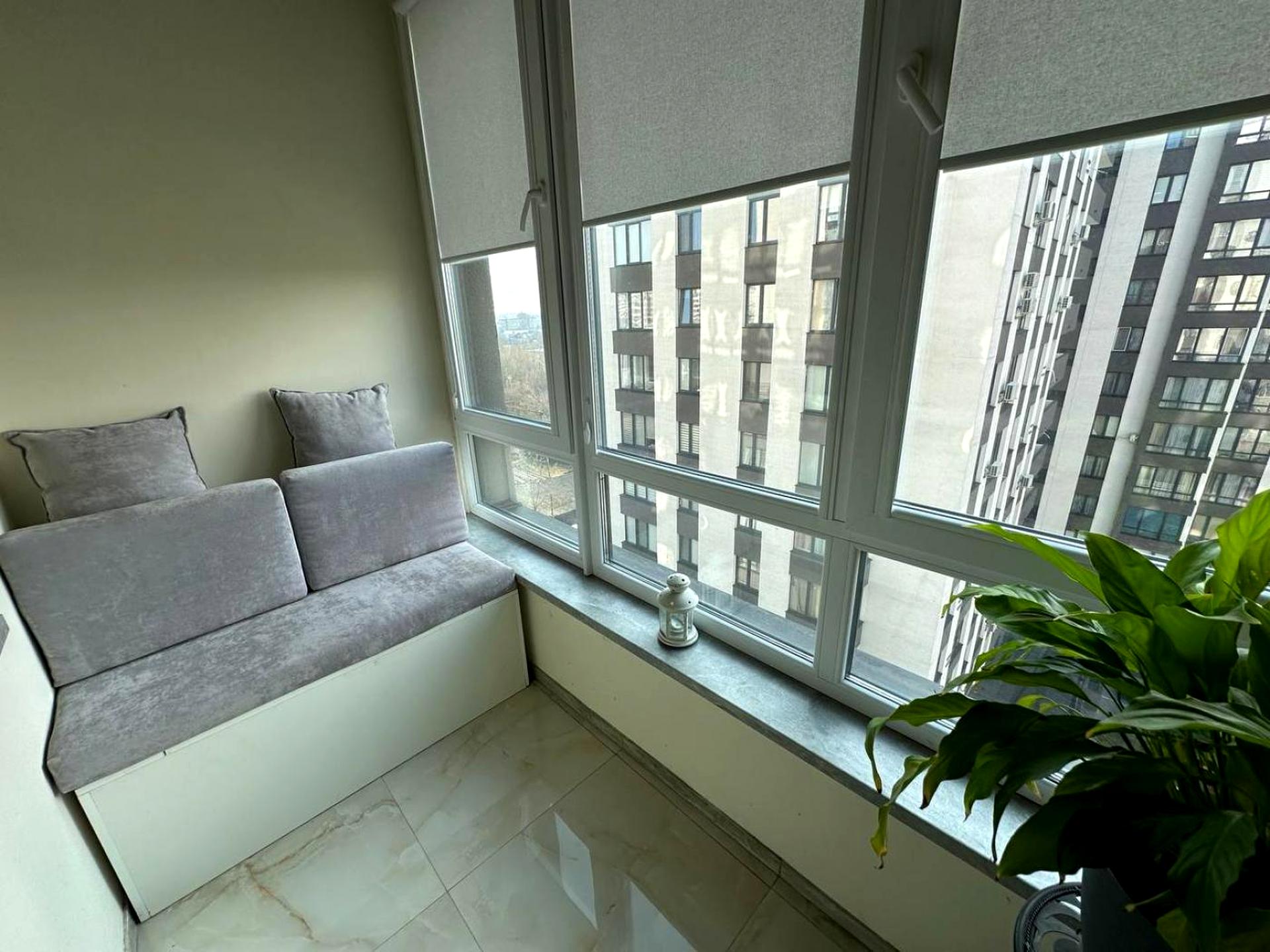 Кухня-студія, ізольована спальня та лоджія з диванчиком для зручного відпочинку.